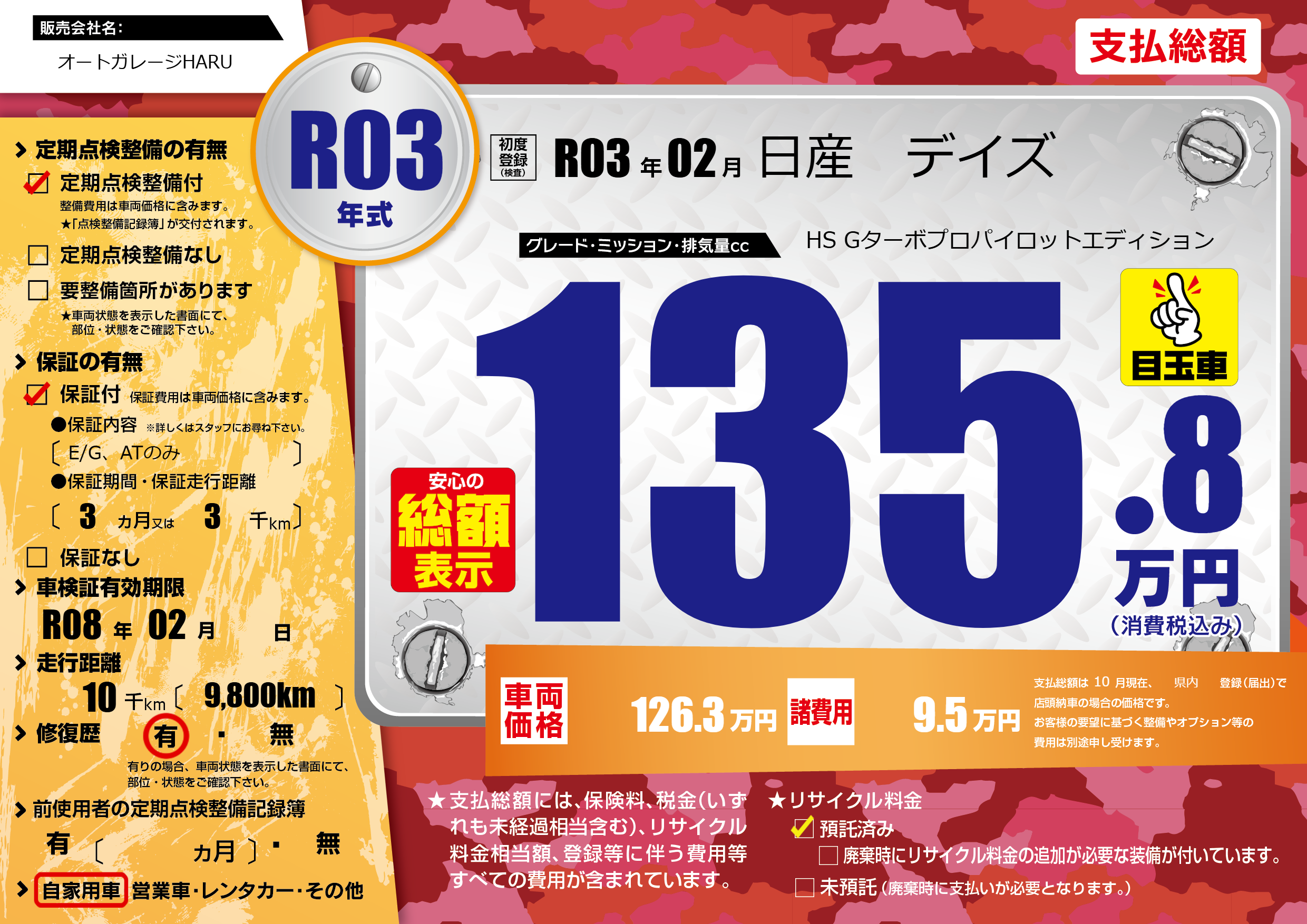 | 車名 | 日産 デイズ | グレード ミッション 排気量 |