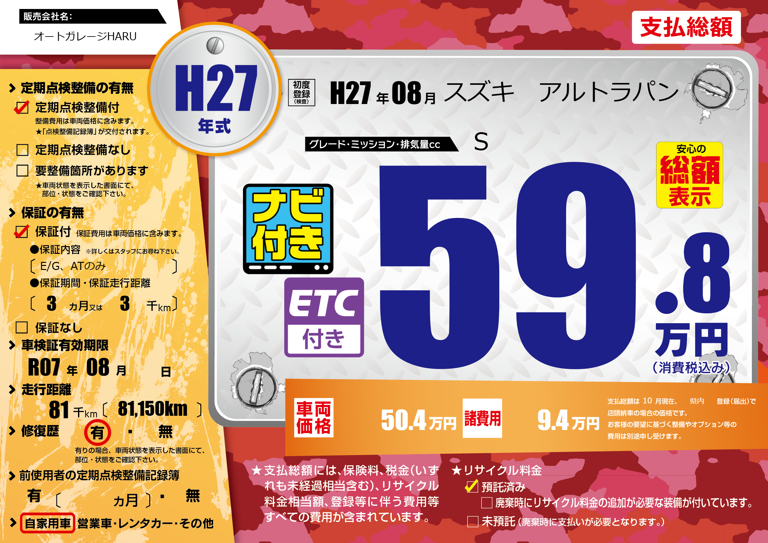 | 走行キロ | 8.1万km | 初年度登録 | H27年08月 |
