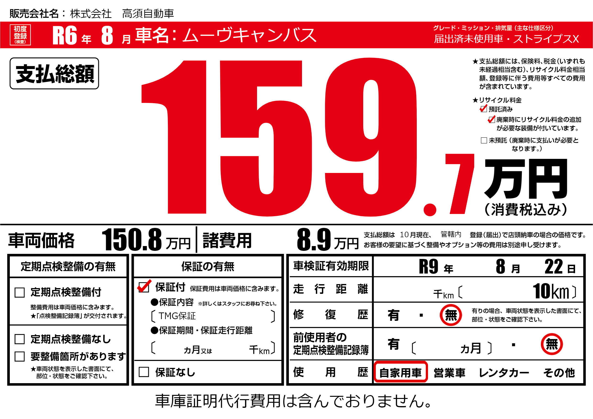| 走行キロ | - | 初年度登録 | R6年8月 |