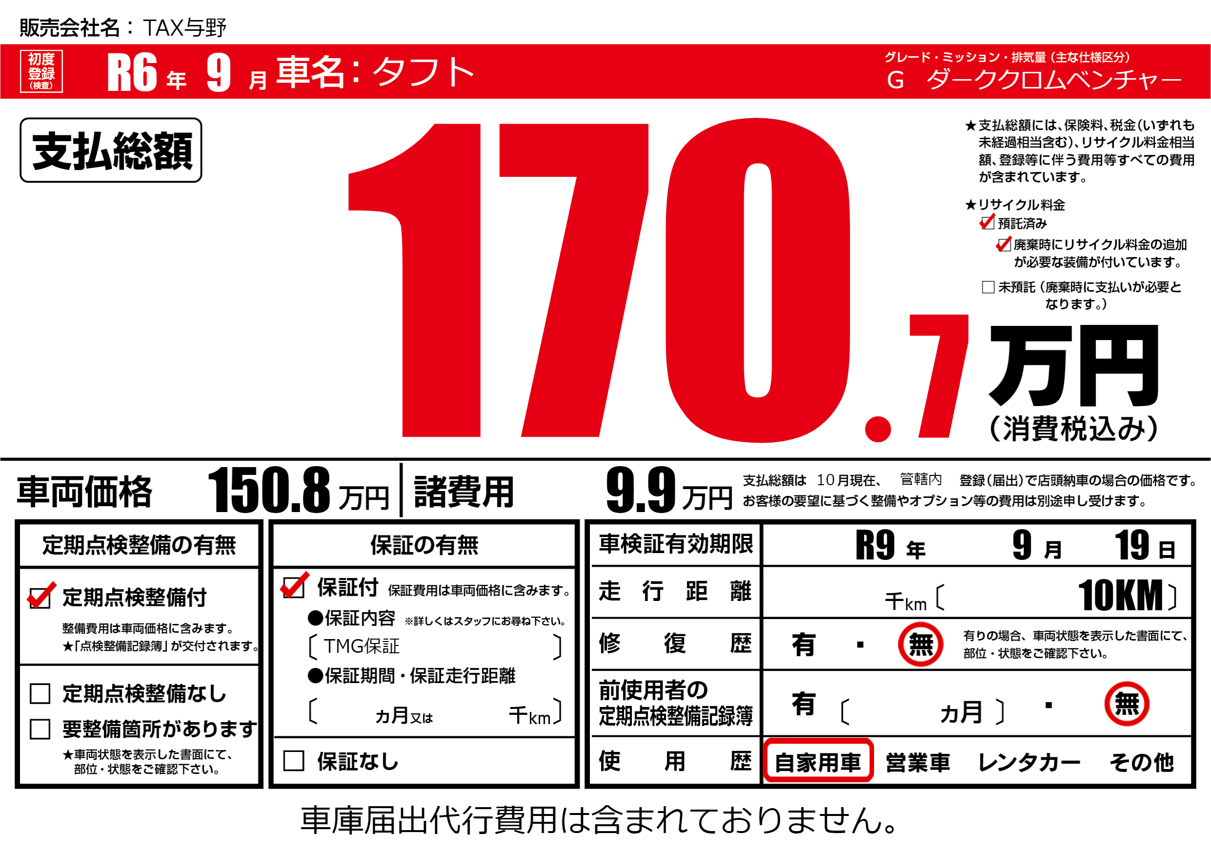 保証付き 保証内容(TMG保証) ---ヶ月または()千kmまで |