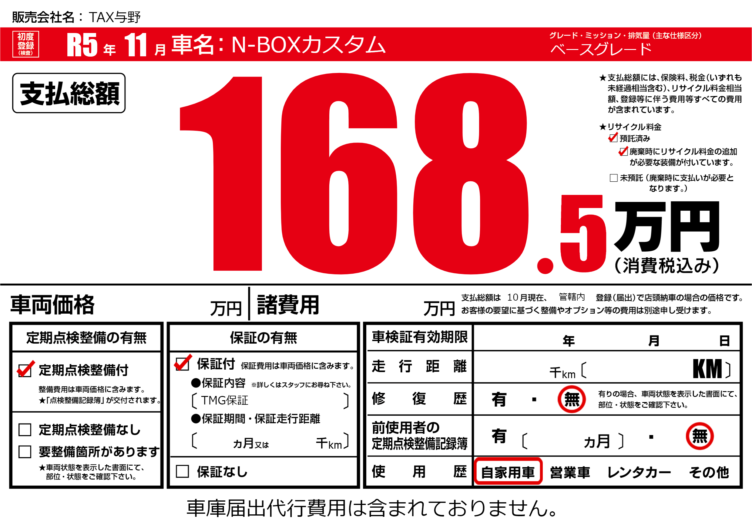 保証付き 保証内容(TMG保証) ---ヶ月または()千kmまで |