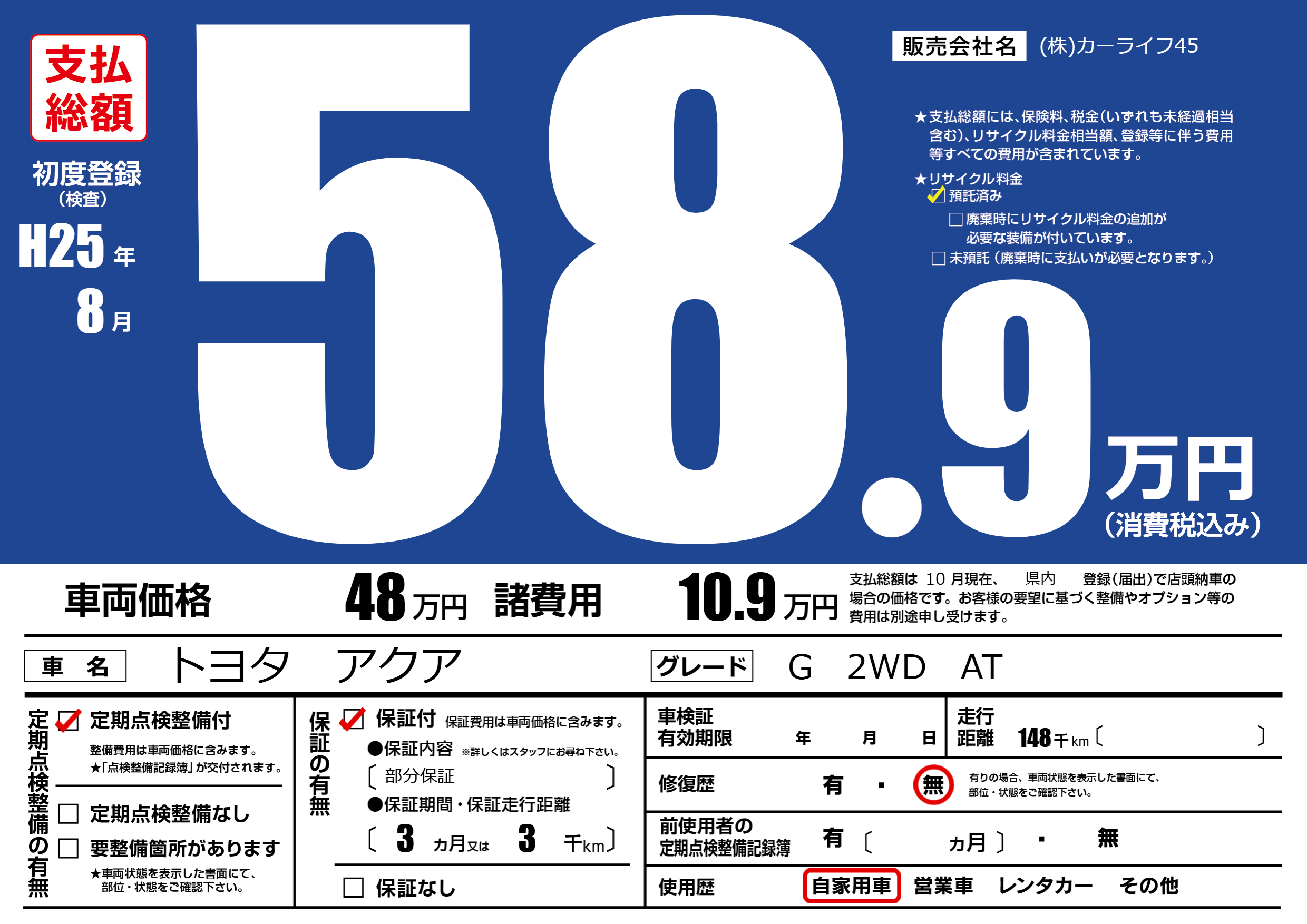 | 走行キロ | 14.8万km | 初年度登録 | H25年8月 |