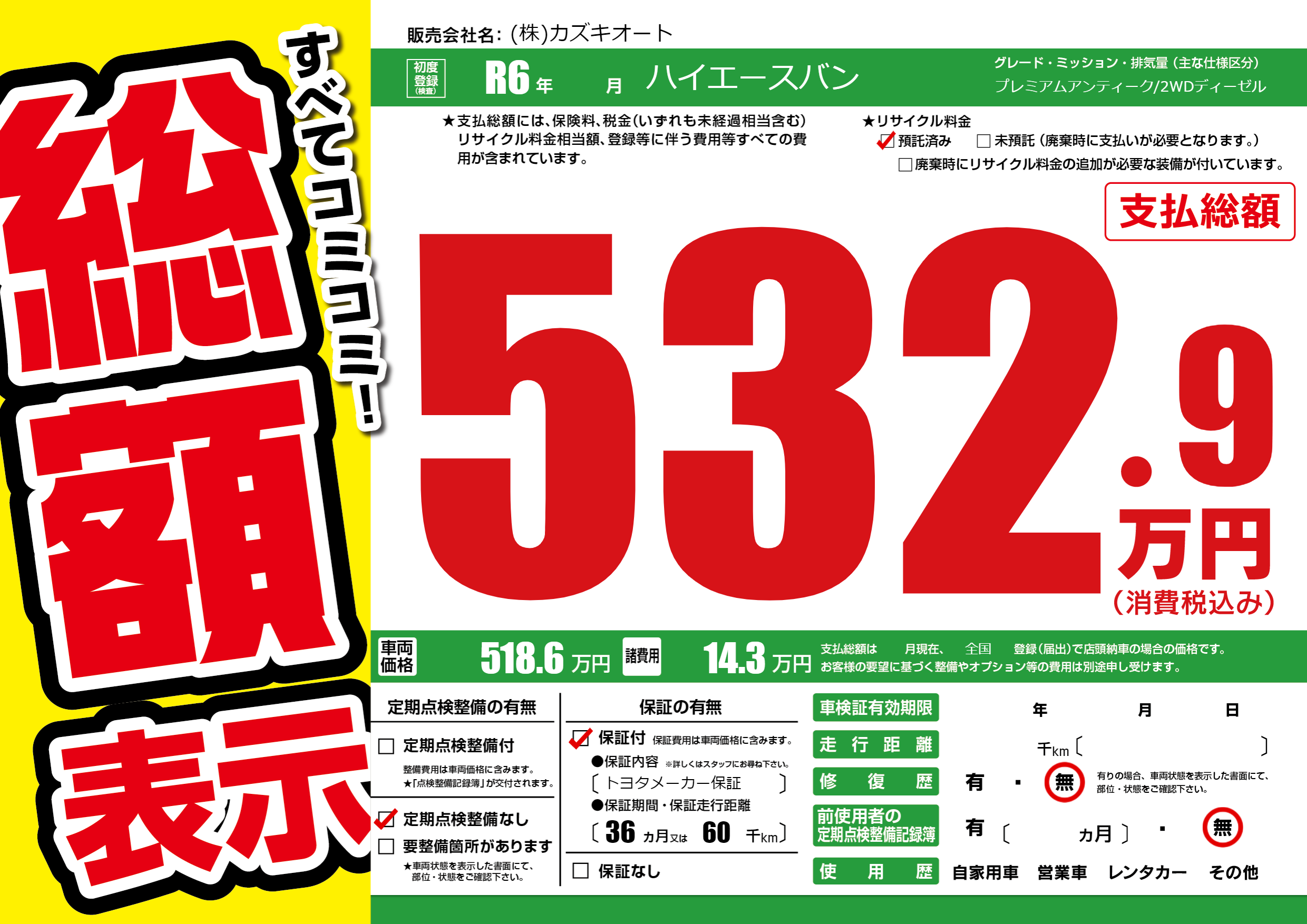 | 車名 | ハイエースバン | グレード ミッション 排気量 |
