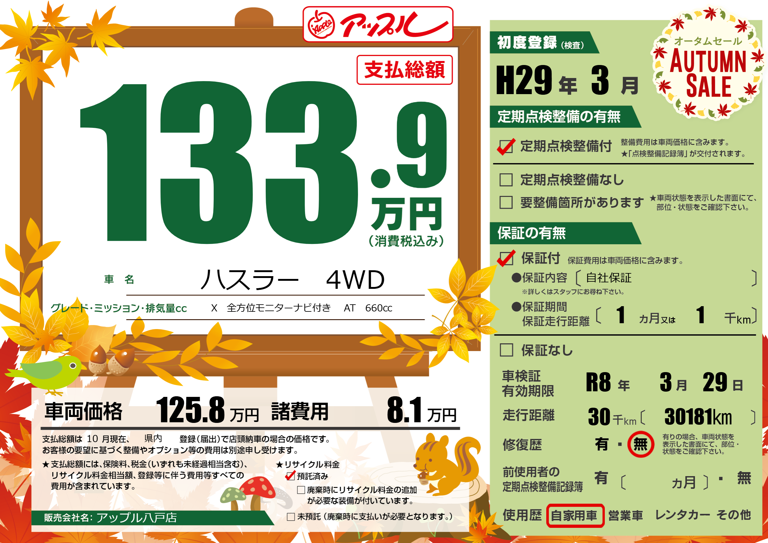 | 走行キロ | 3万km | 初年度登録 | H29年3月 |