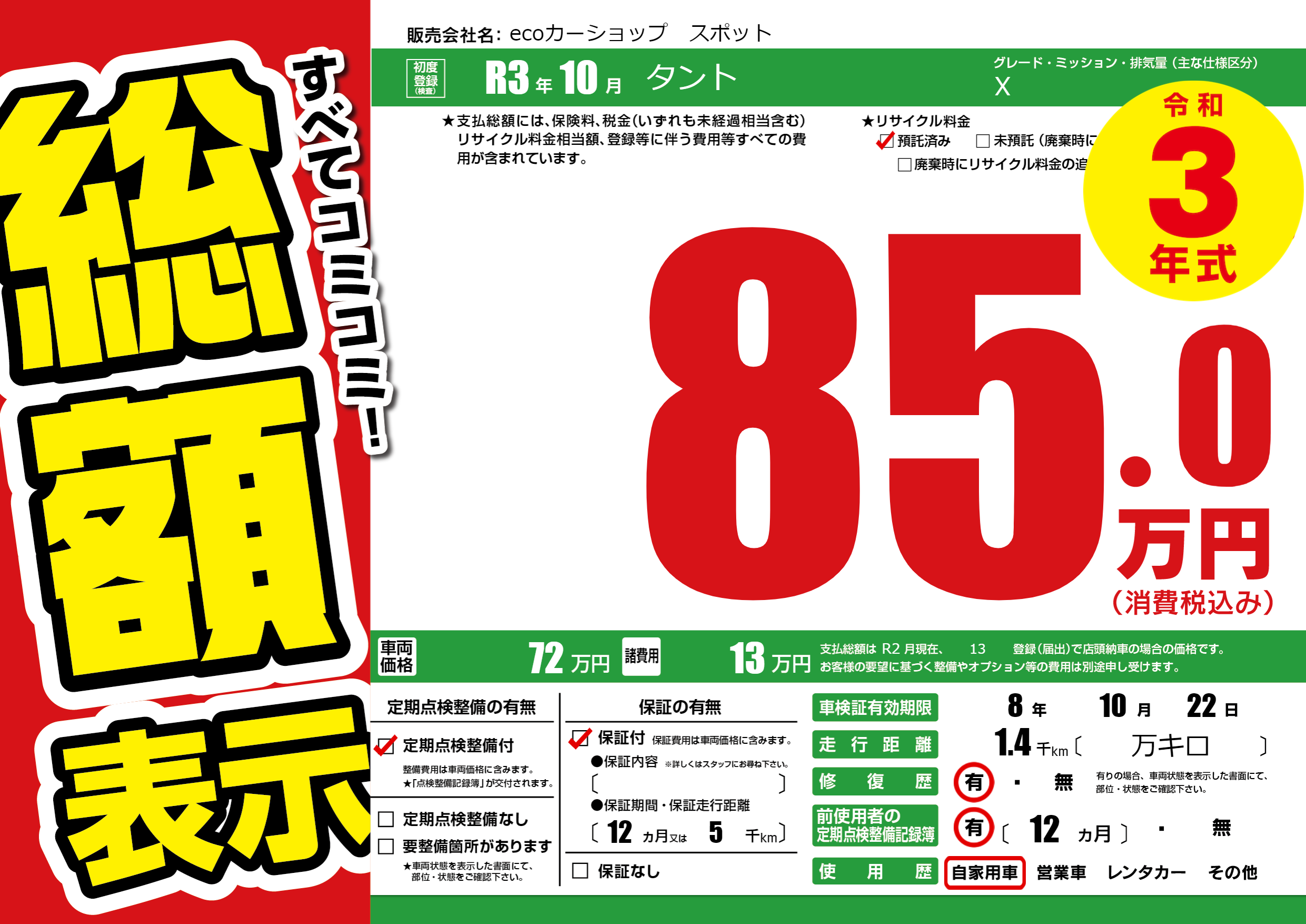 | 走行キロ | 0.1万km | 初年度登録 | R3年10月 |