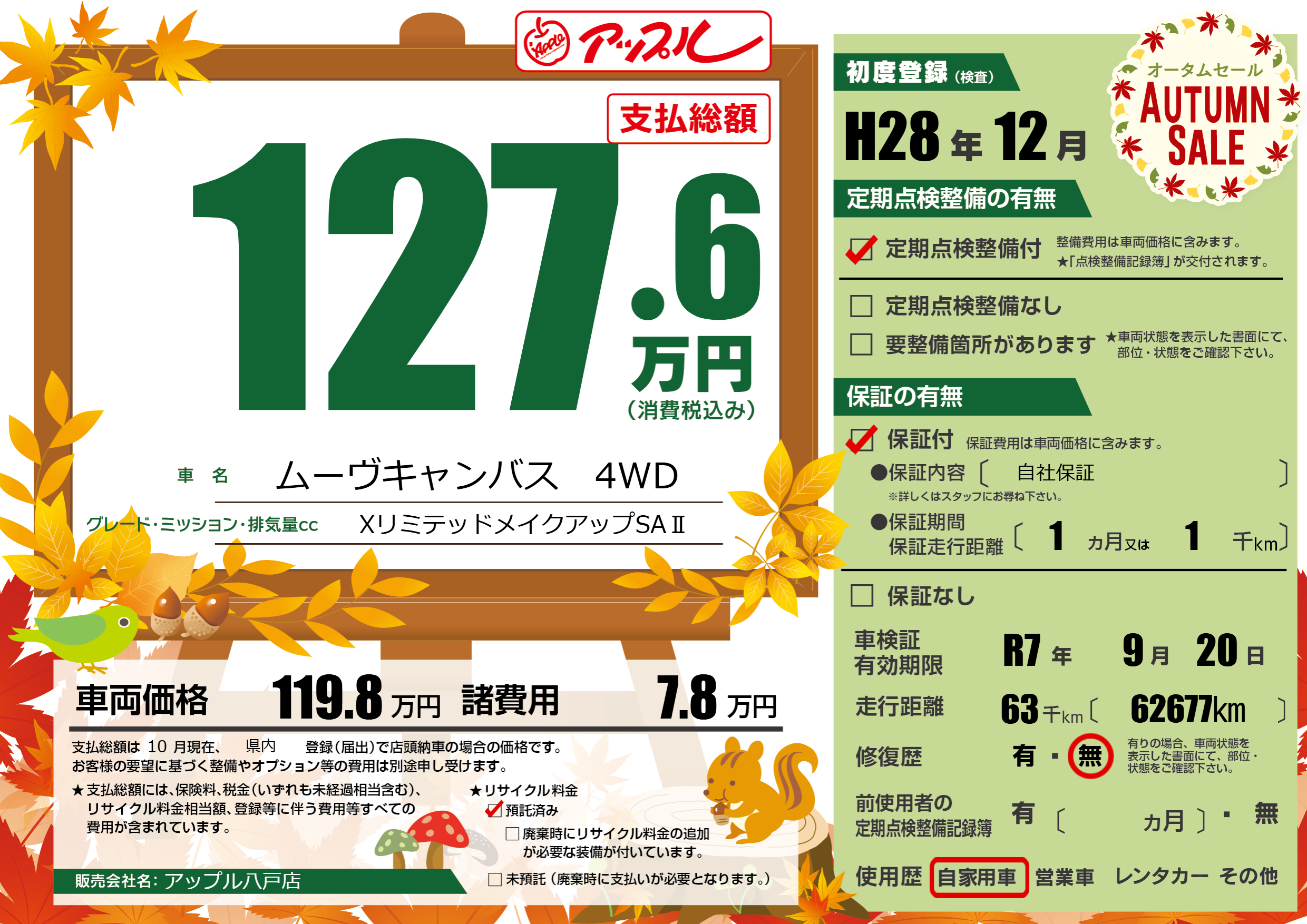 なし | 車検制限 | R7年9月20月 |