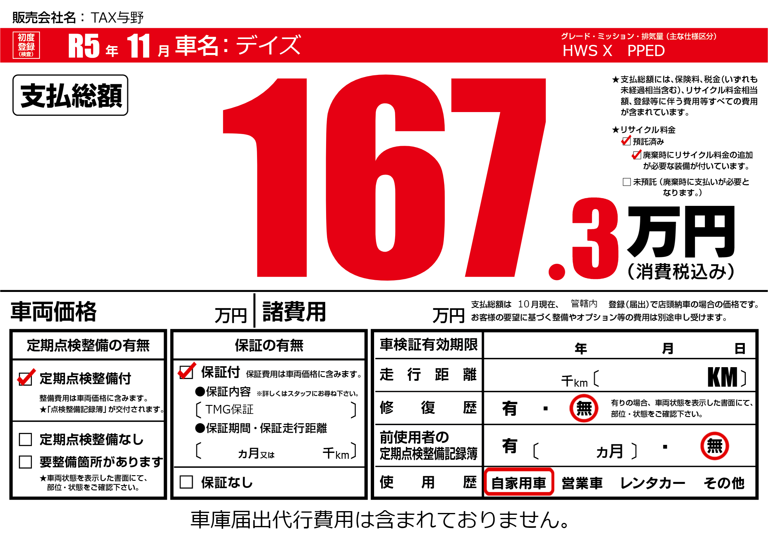 保証付き 保証内容(TMG保証) ---ヶ月または()千kmまで |