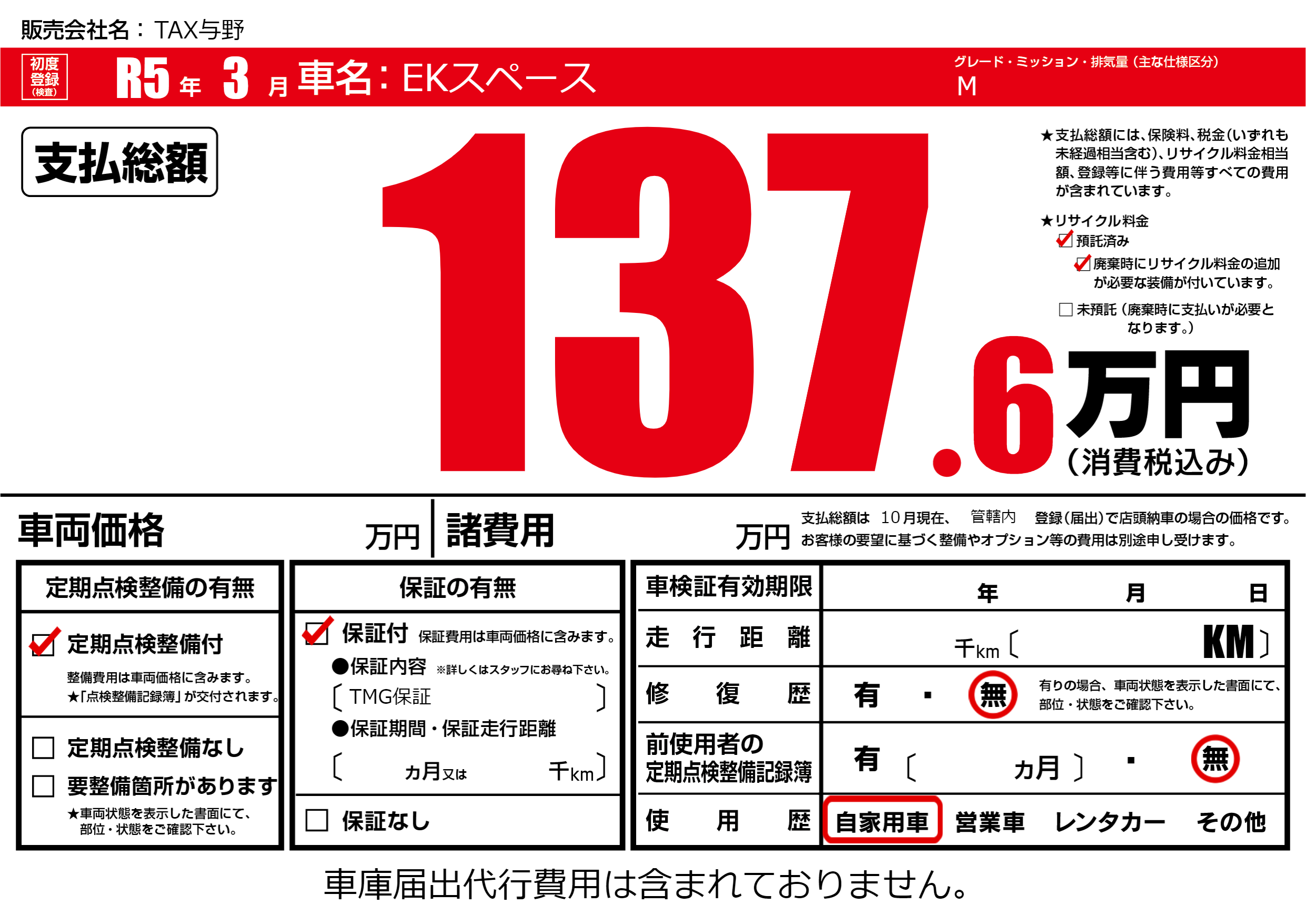 保証付き 保証内容(TMG保証) ---ヶ月または()千kmまで |