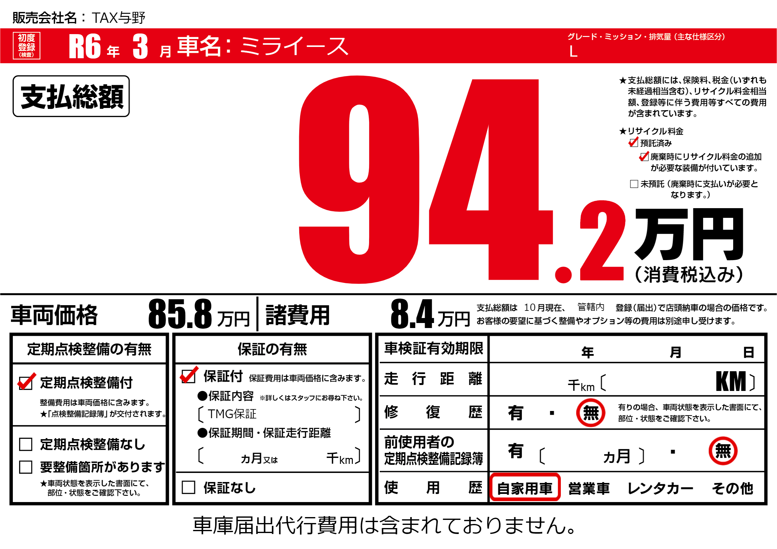 保証付き 保証内容(TMG保証) ---ヶ月または()千kmまで |