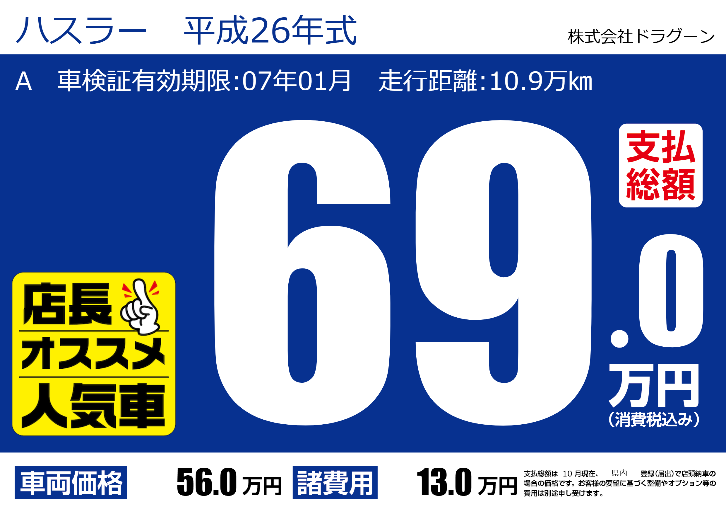 | 車名 | ハスラー 平成26年式 | グレード ミッション 排気量 |