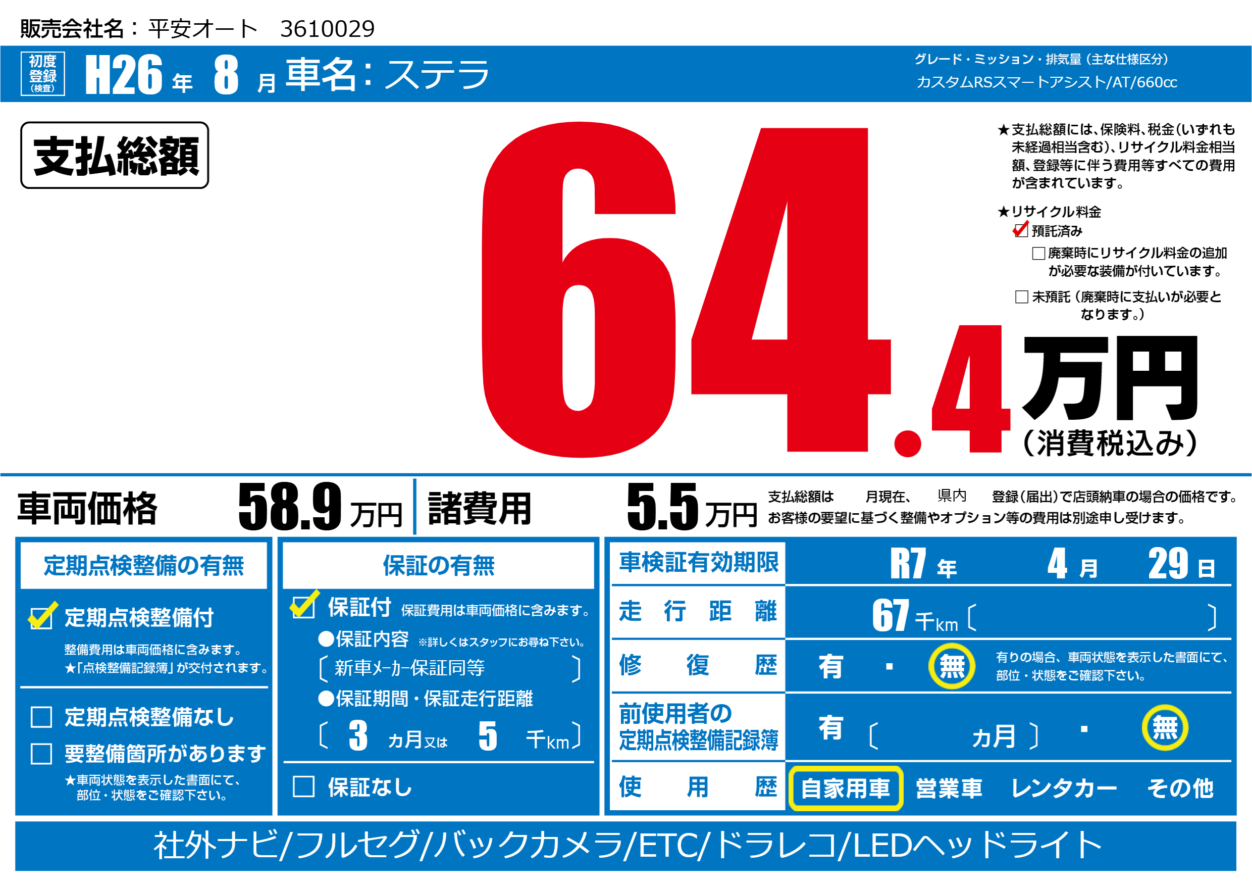 | 走行キロ | 6.7万km | 初年度登録 | H26年8月 |
