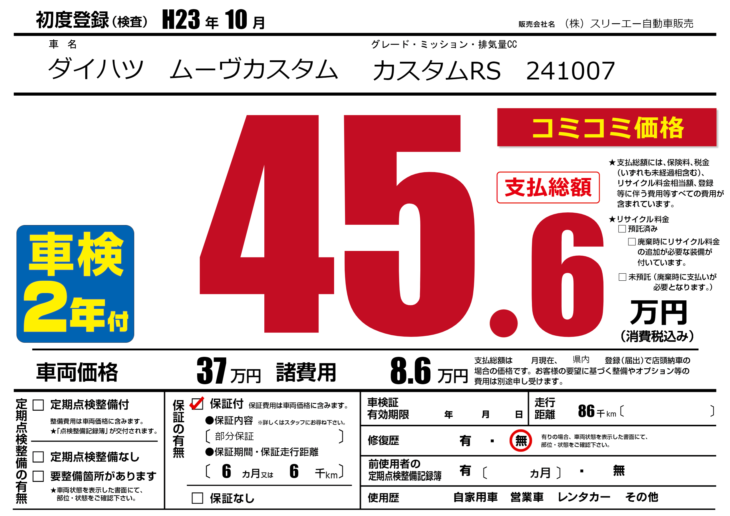 | 走行キロ | 8.6万km | 初年度登録 | H23年10月 |