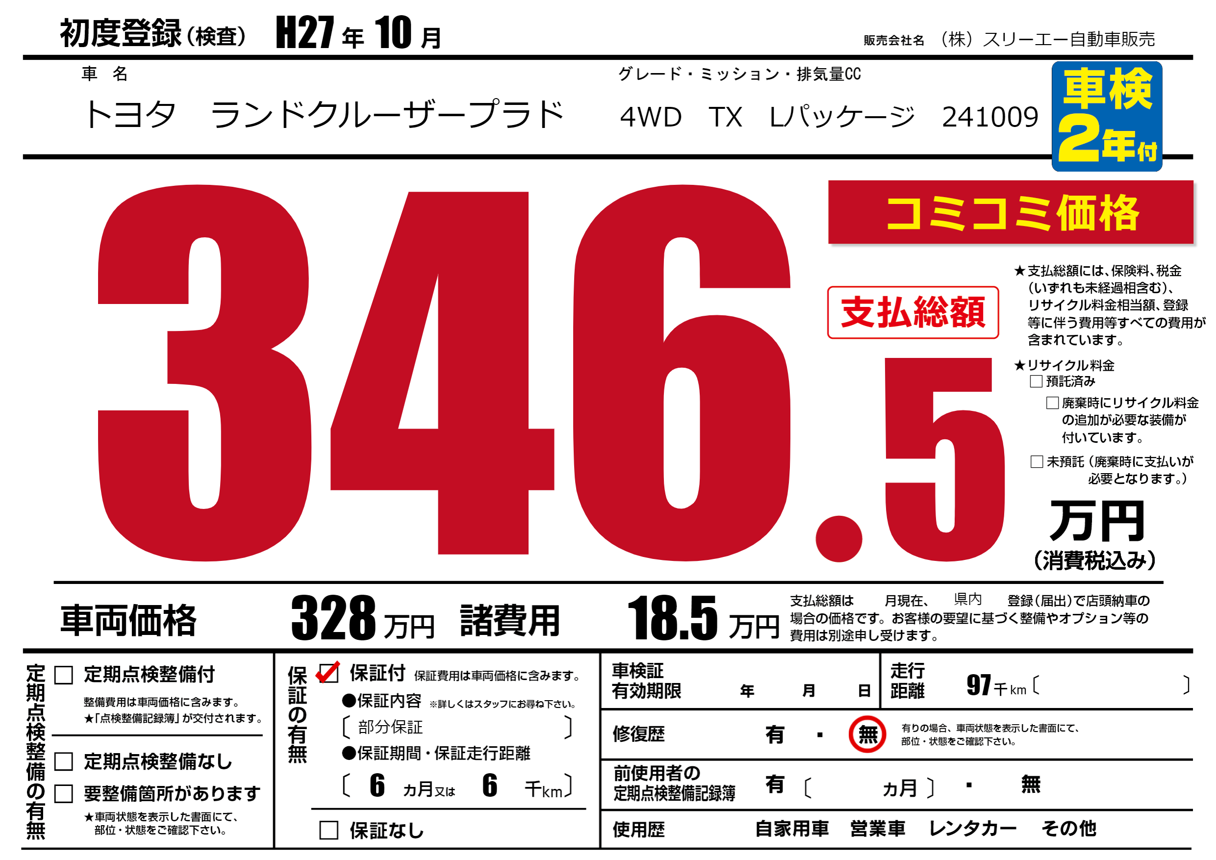 | 車名 | トヨタ ランドクルーザープラド | グレード ミッション 排気量 |