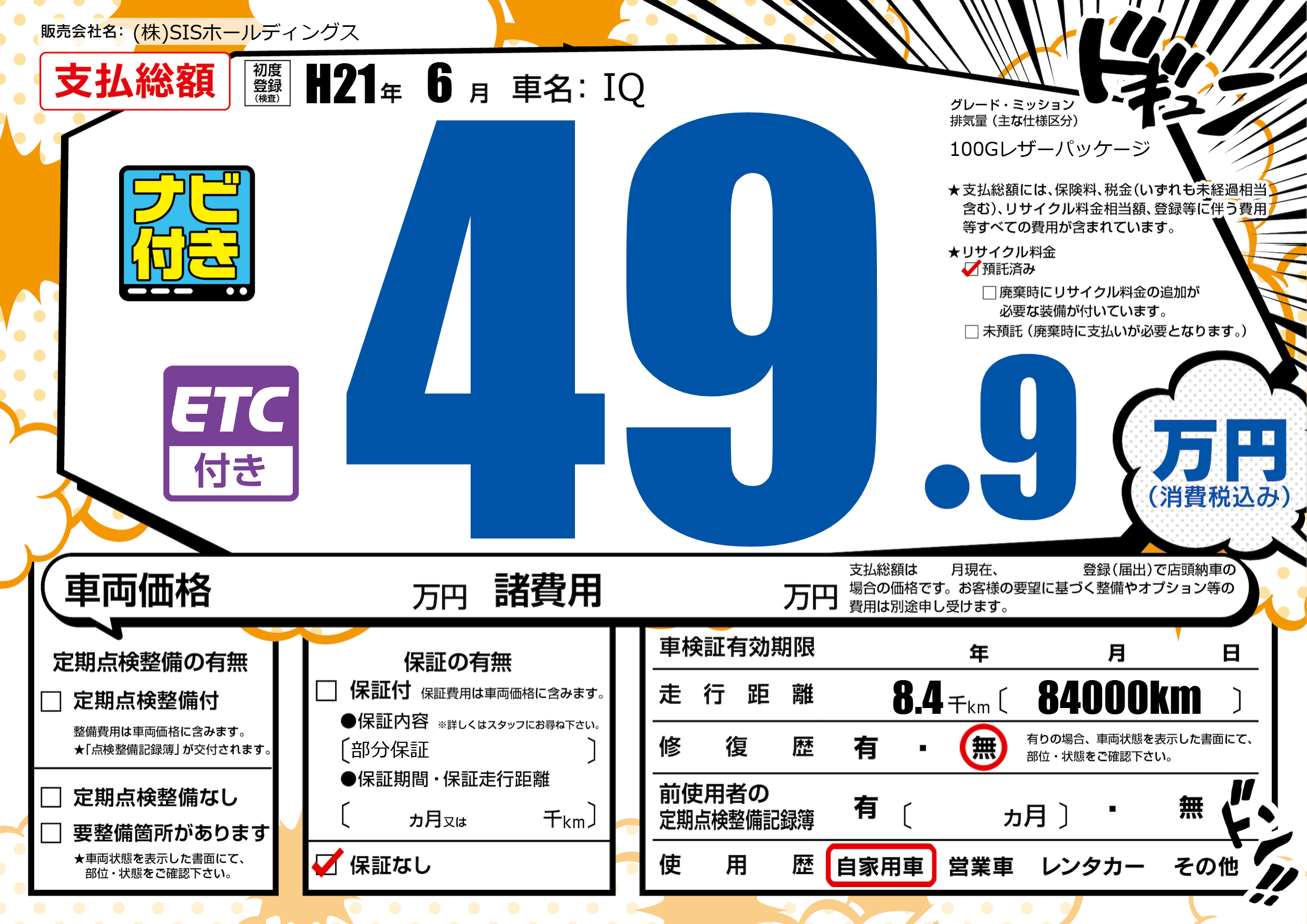 | 走行キロ | 0.8万km | 初年度登録 | H21年6月 |