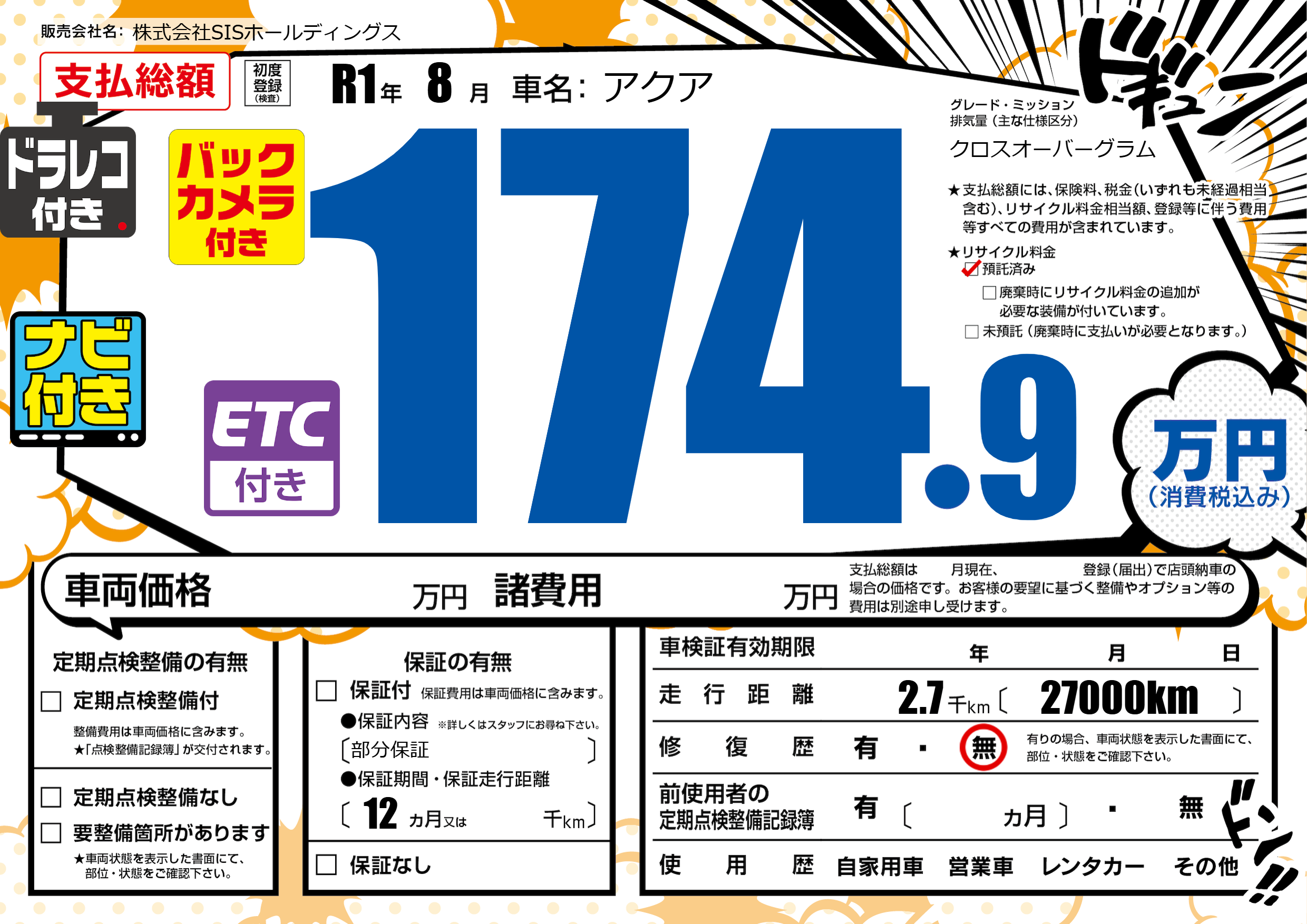 | 車名 | アクア | グレード ミッション 排気量 |