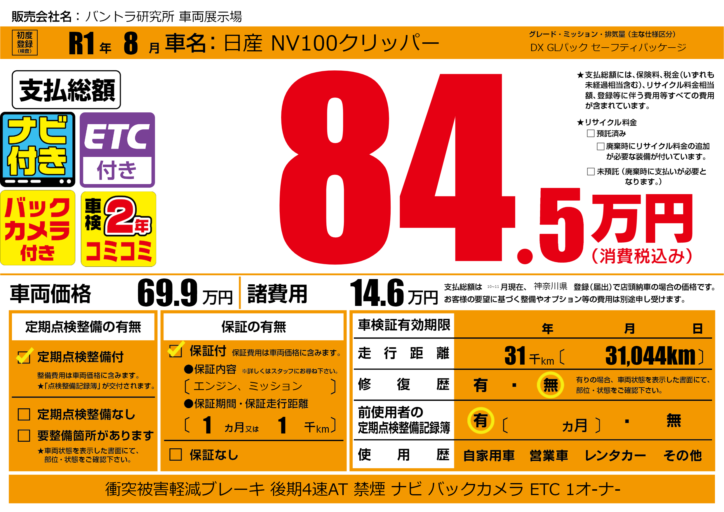 | 車名 | 日産 NV100クリッパー | グレード ミッション 排気量 |