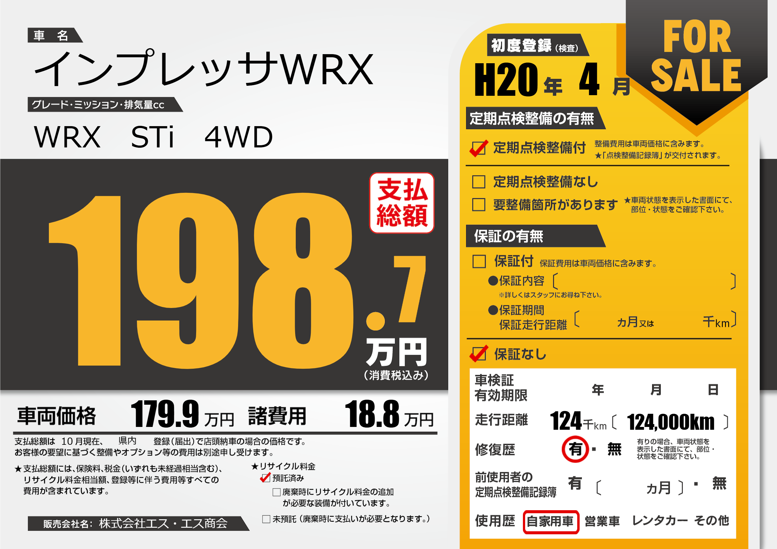 | 車名 | インプレッサWRX | グレード ミッション 排気量 |