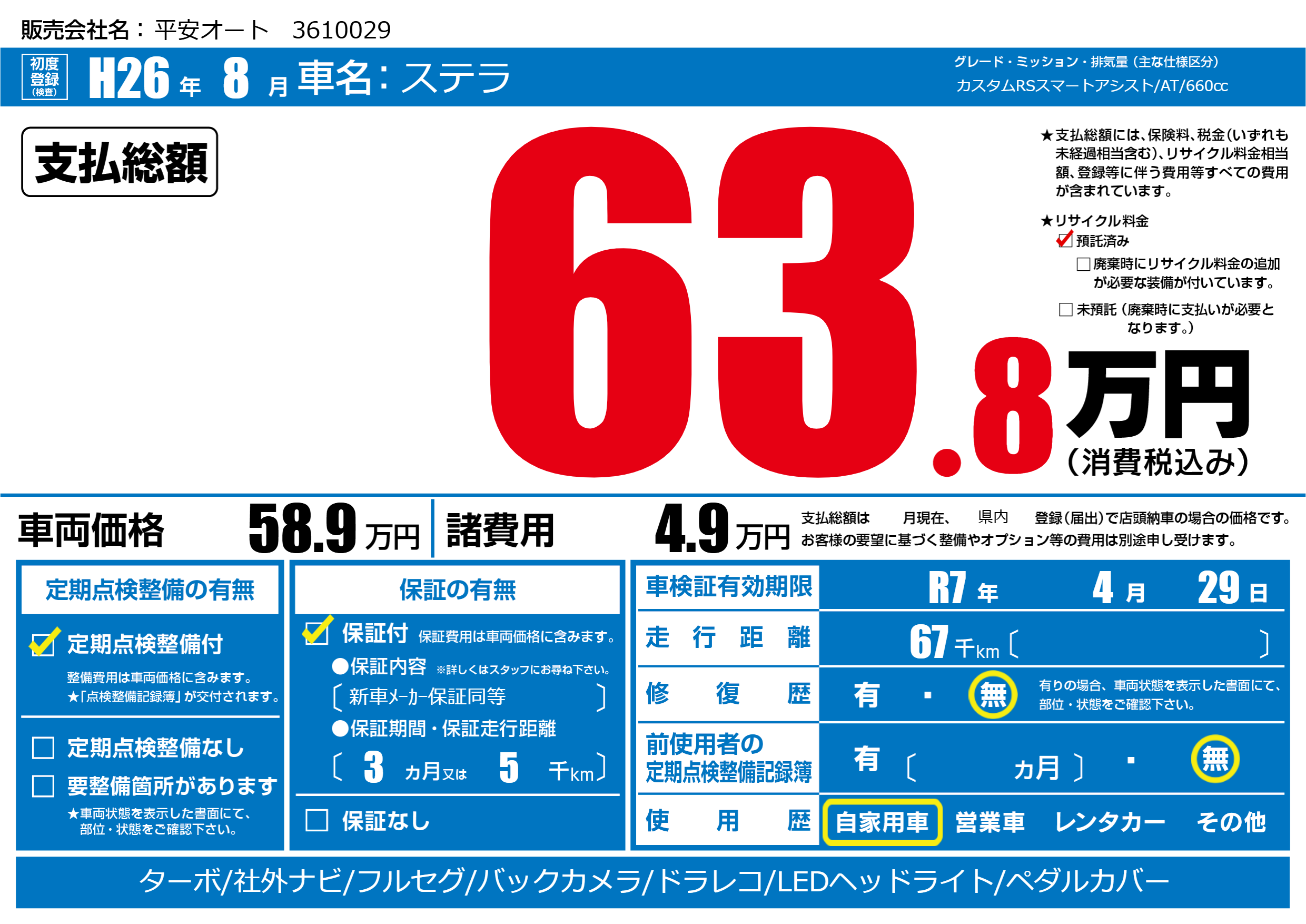 | 車検制限 | R7年 4月 29日 | ||