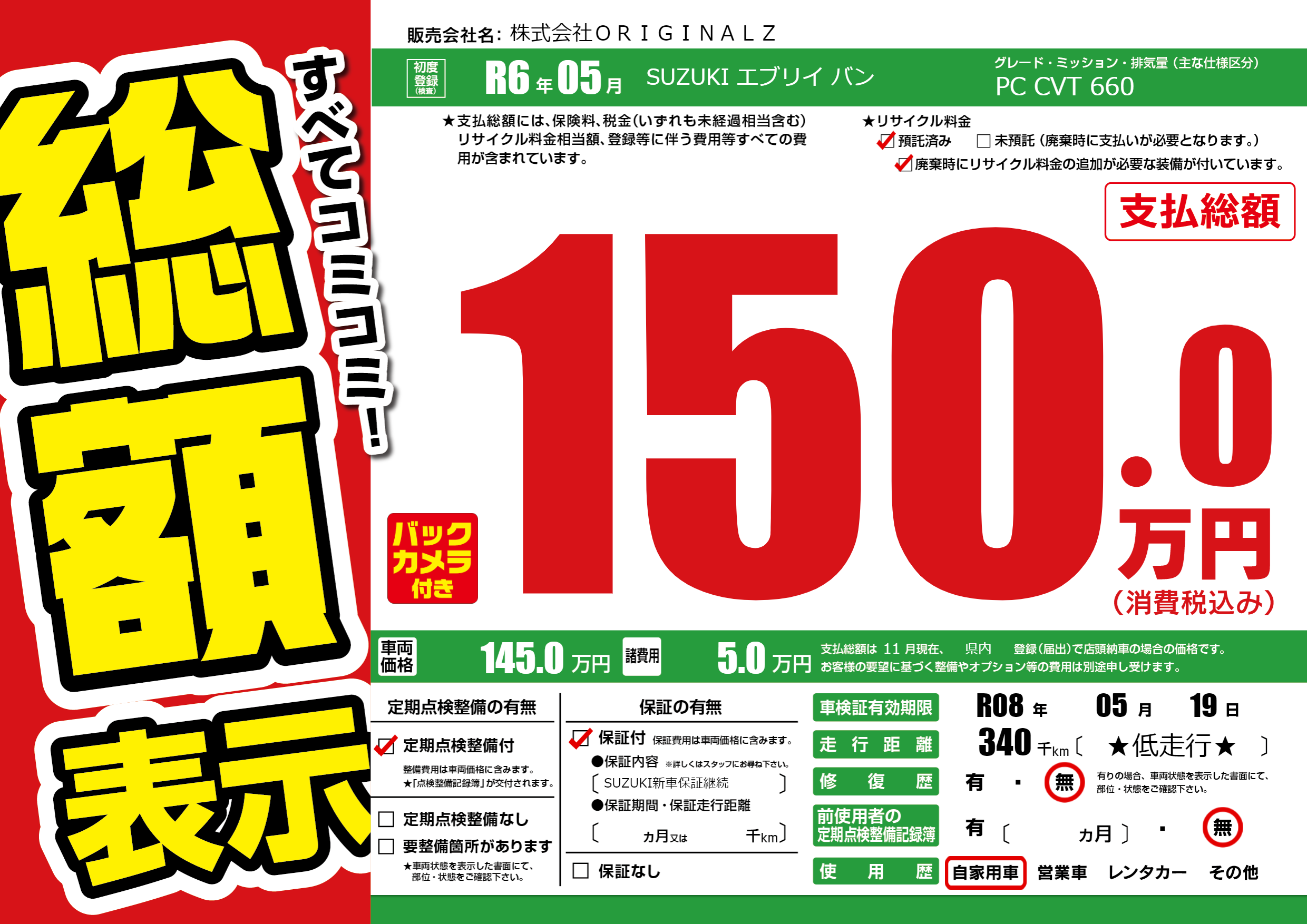 | 車名 | SUZUKI エブリイ バン | グレード ミッション 排気量 |