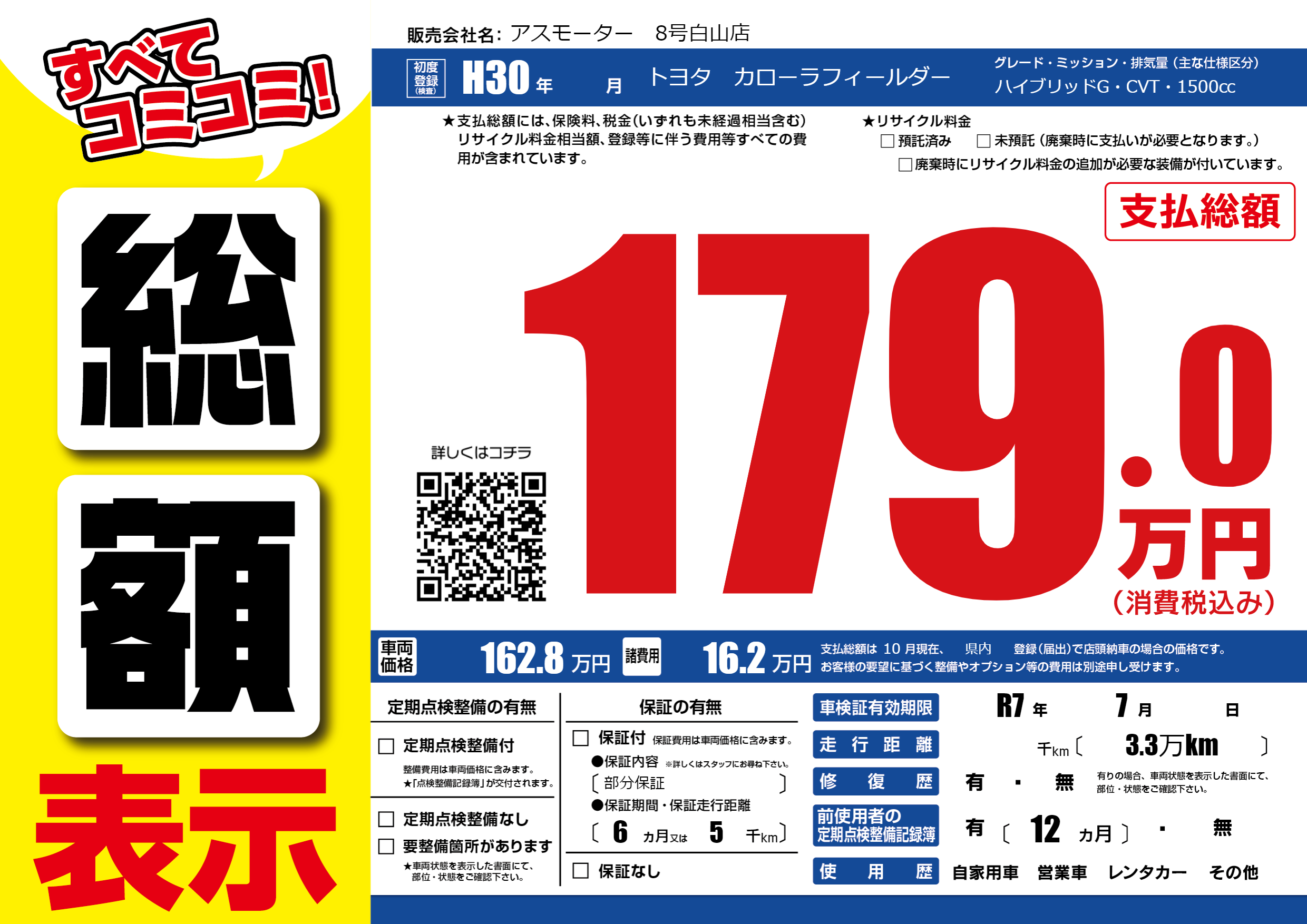 | 車名 | トヨタ カローラフィールダー | グレード ミッション 排気量 |
