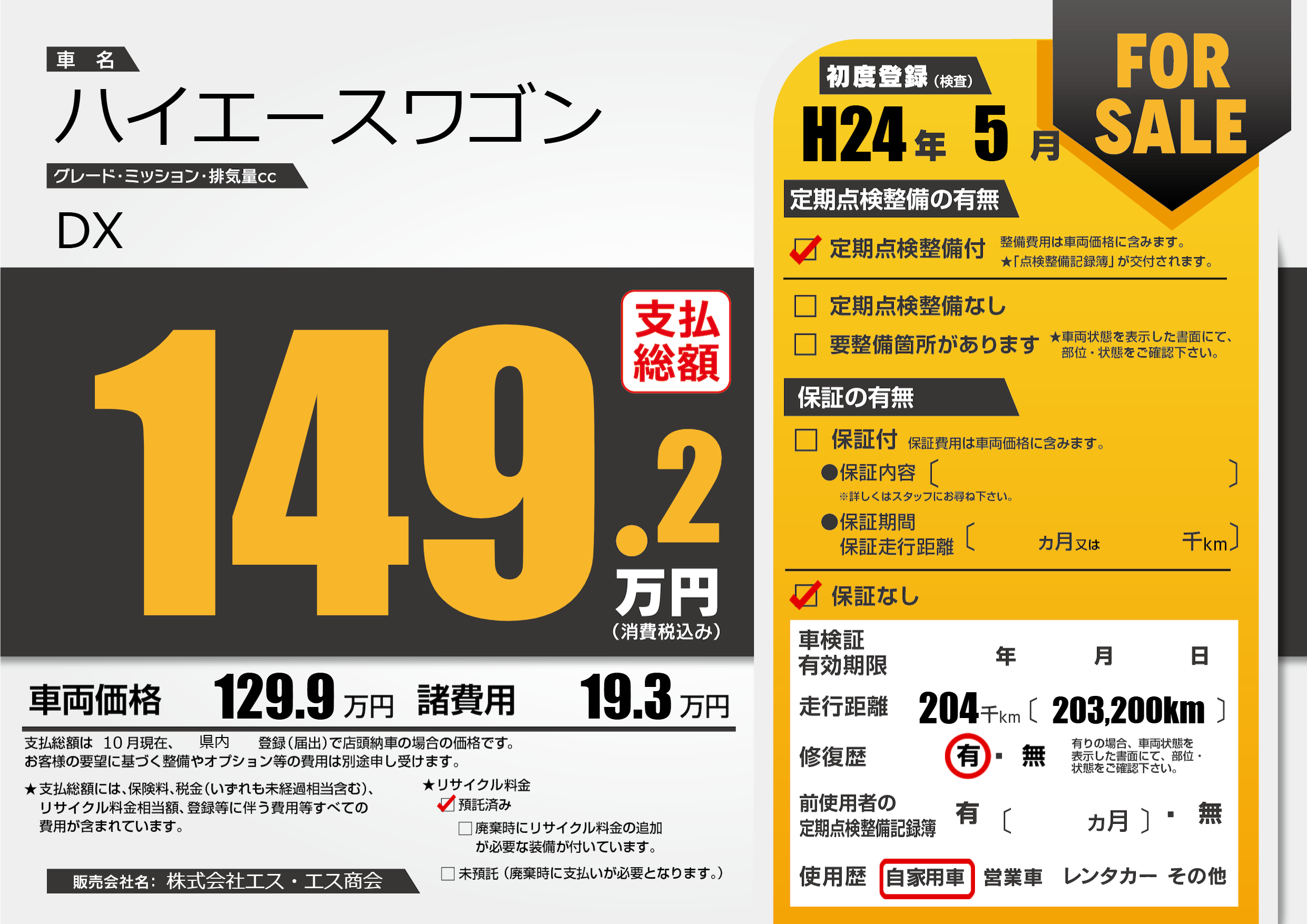 | 車名 | ハイエースワゴン | グレード ミッション 排気量 |
