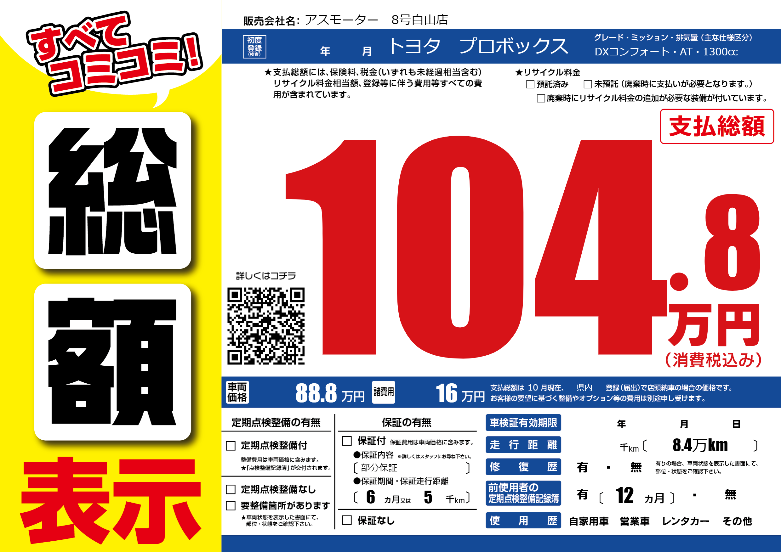 | 車名 | トヨタ プロボックス | グレード ミッション 排気量 |