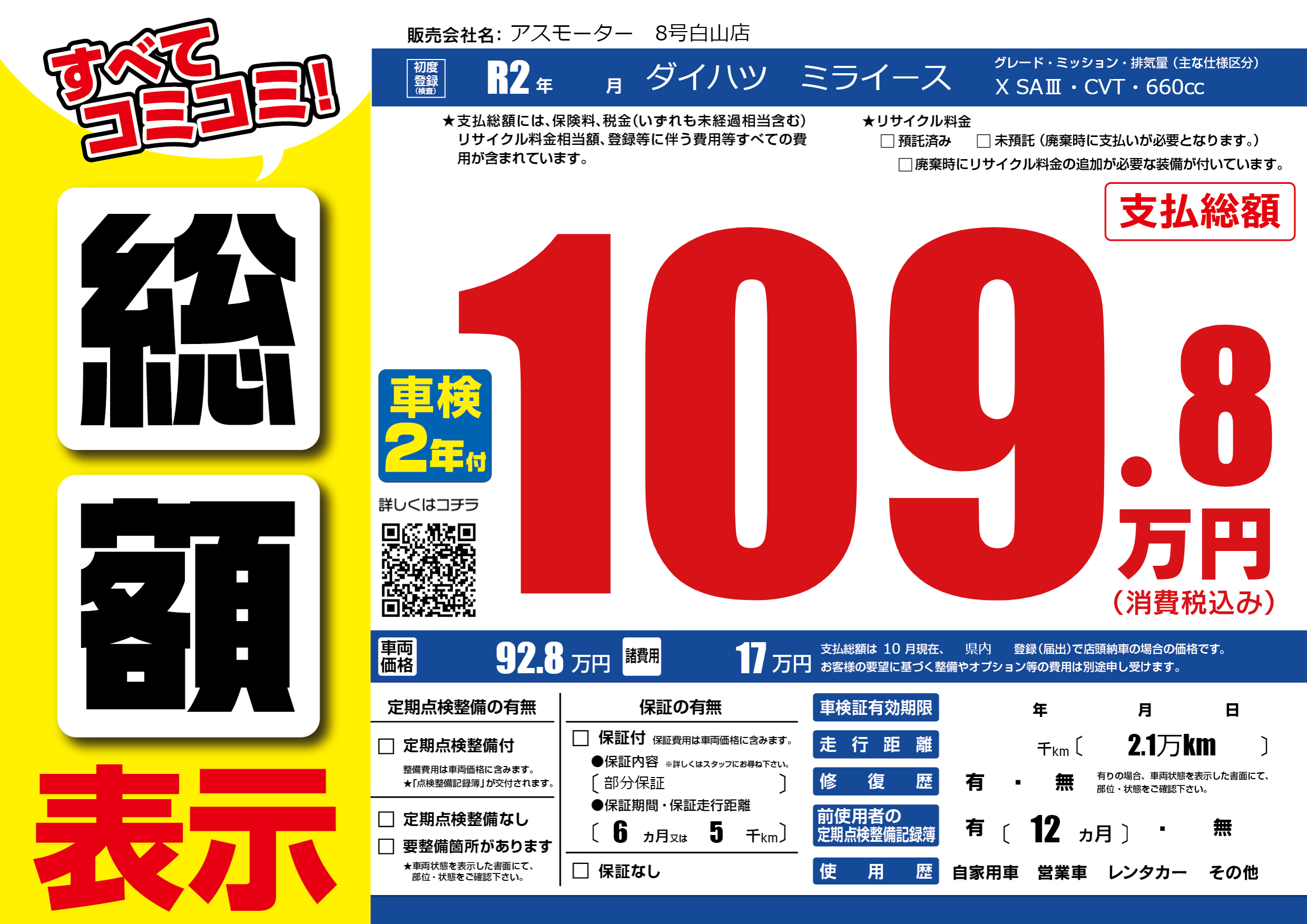 | 走行キロ | - | 初年度登録 | R2年---月 |