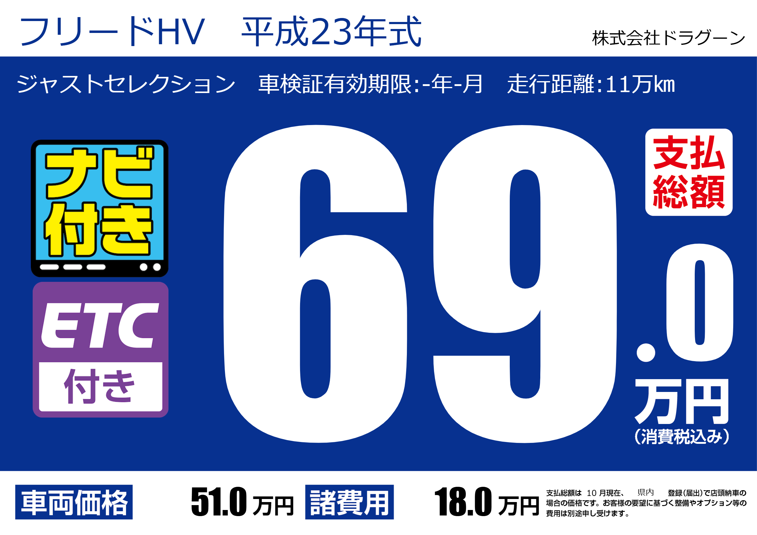 | 車名 | フリードHV 平成23年式 | グレード ミッション 排気量 |