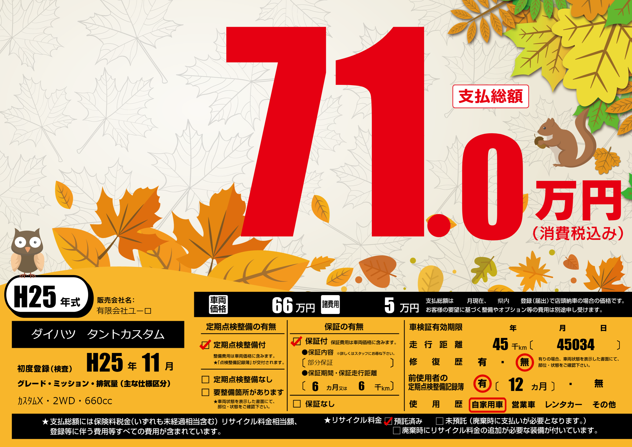 | 走行キロ | 4.5万km | 初年度登録 | H25年11月 |