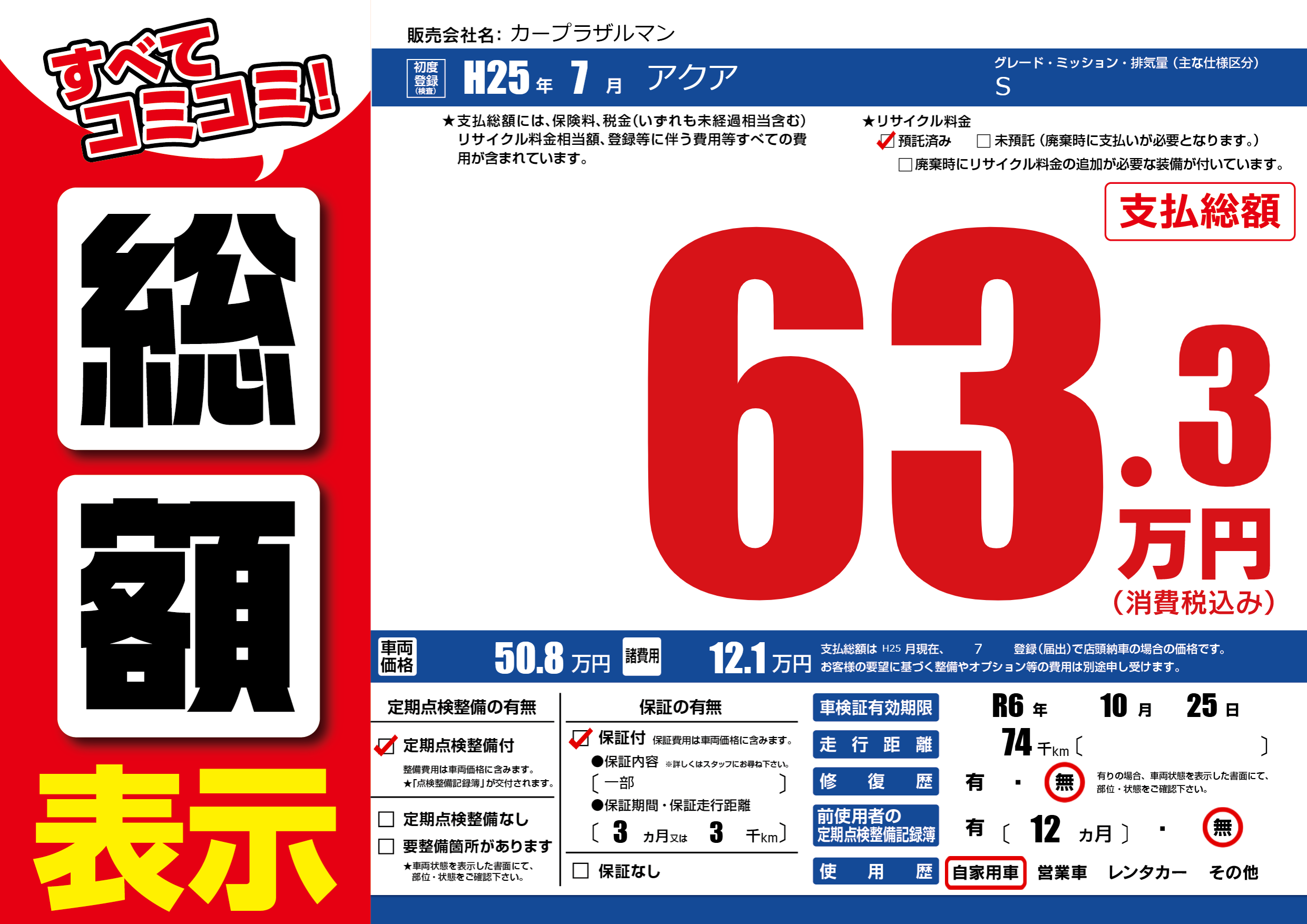 | 走行キロ | 7.4万km | 初年度登録 | H25年7月 |