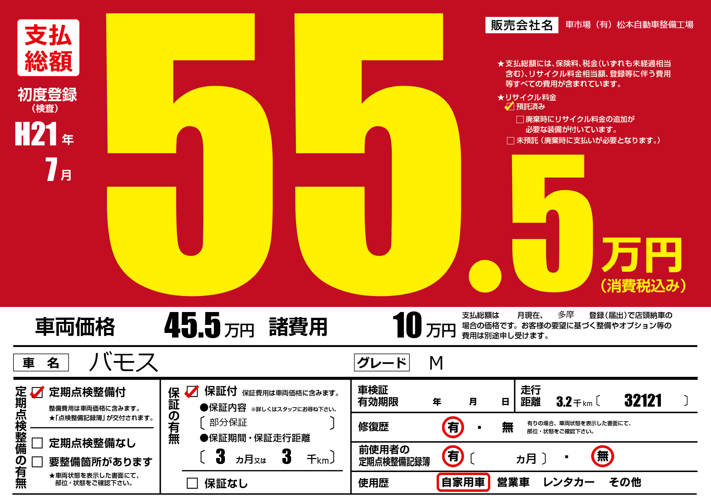 | 走行キロ | 0.3万km | 初年度登録 | H21年7月 |