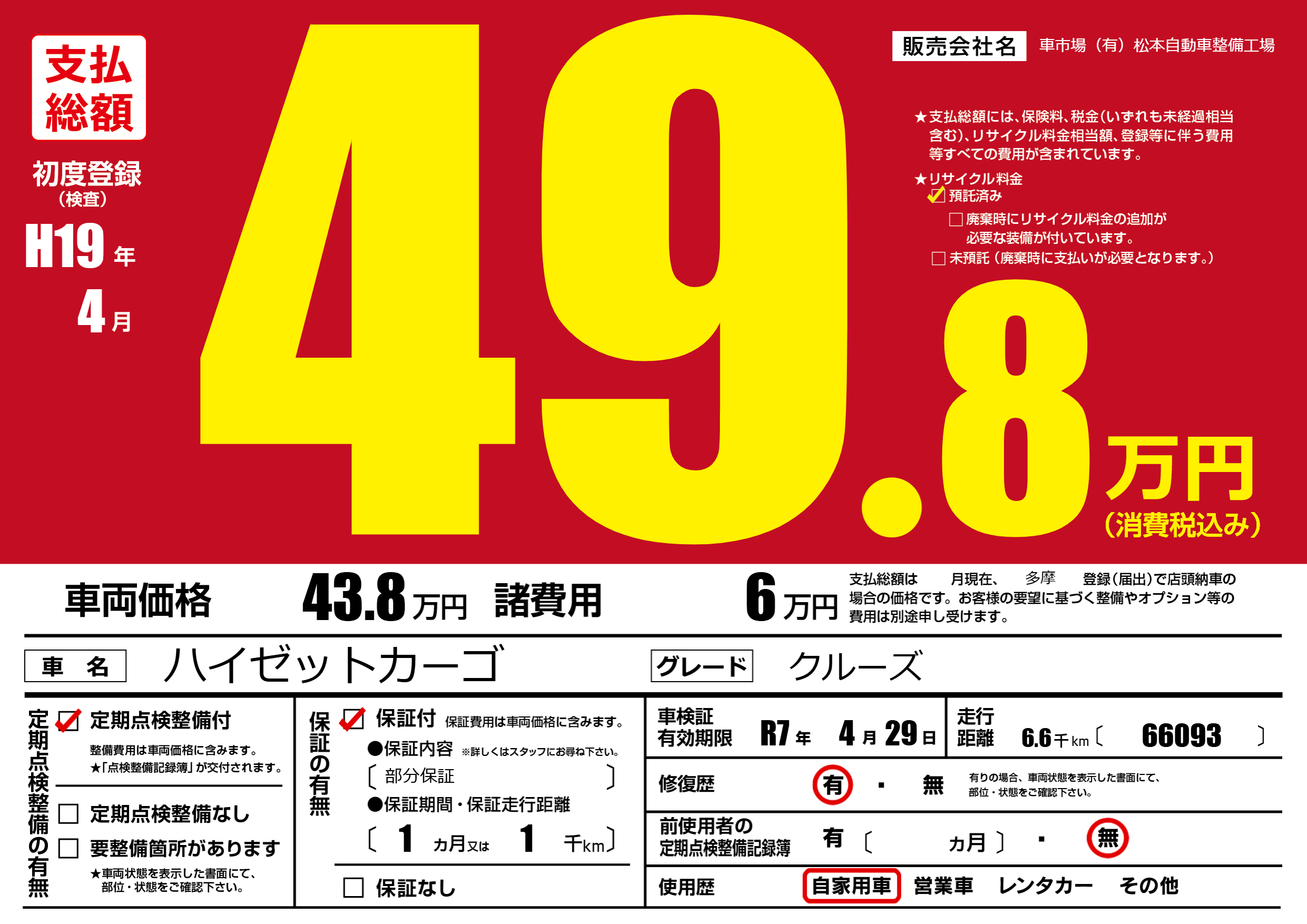 | 車検制限 | R7年 4月 29日 | ||