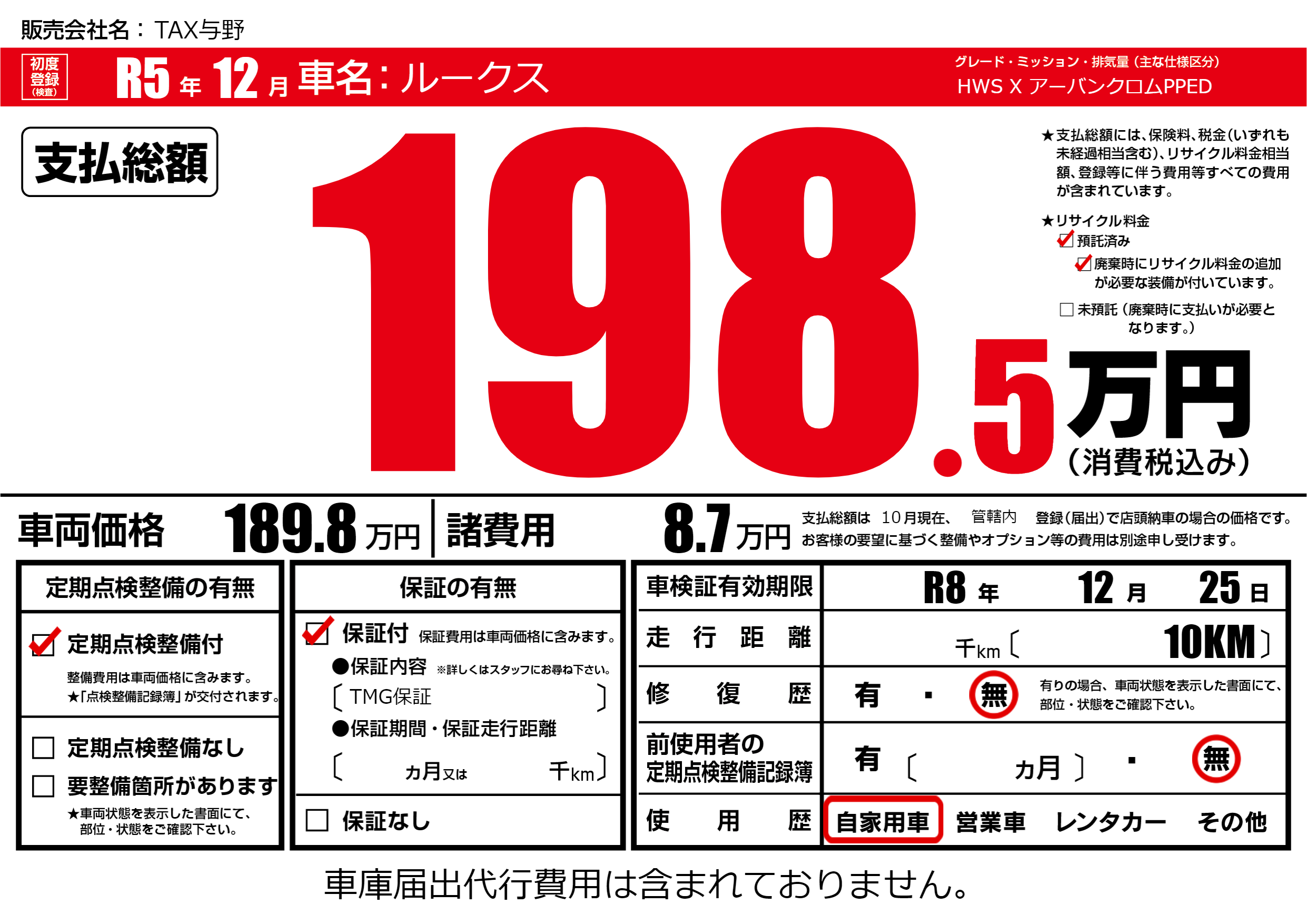 | 走行キロ | - | 初年度登録 | R5年12月 |