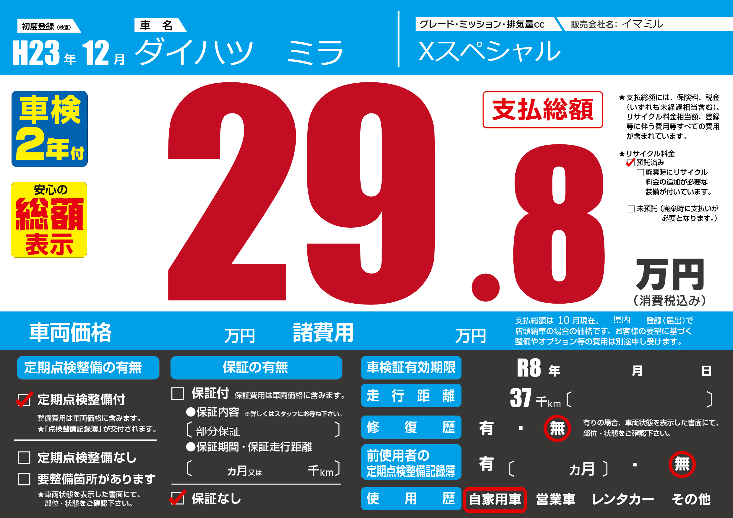 | 走行キロ | 3.7万km | 初年度登録 | H23年12月 |