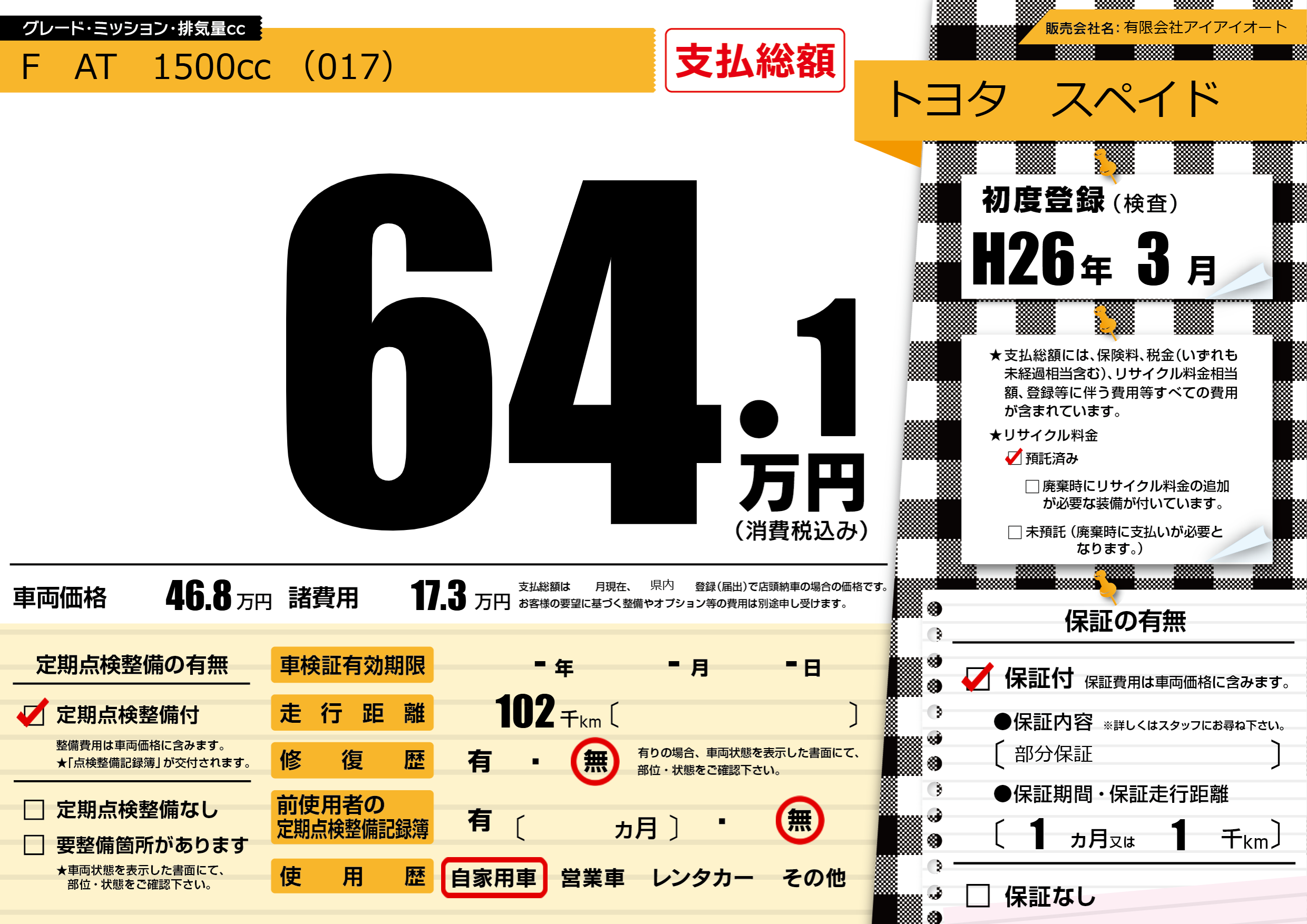 | 車名 | トヨタ スペイド | グレード ミッション 排気量 |