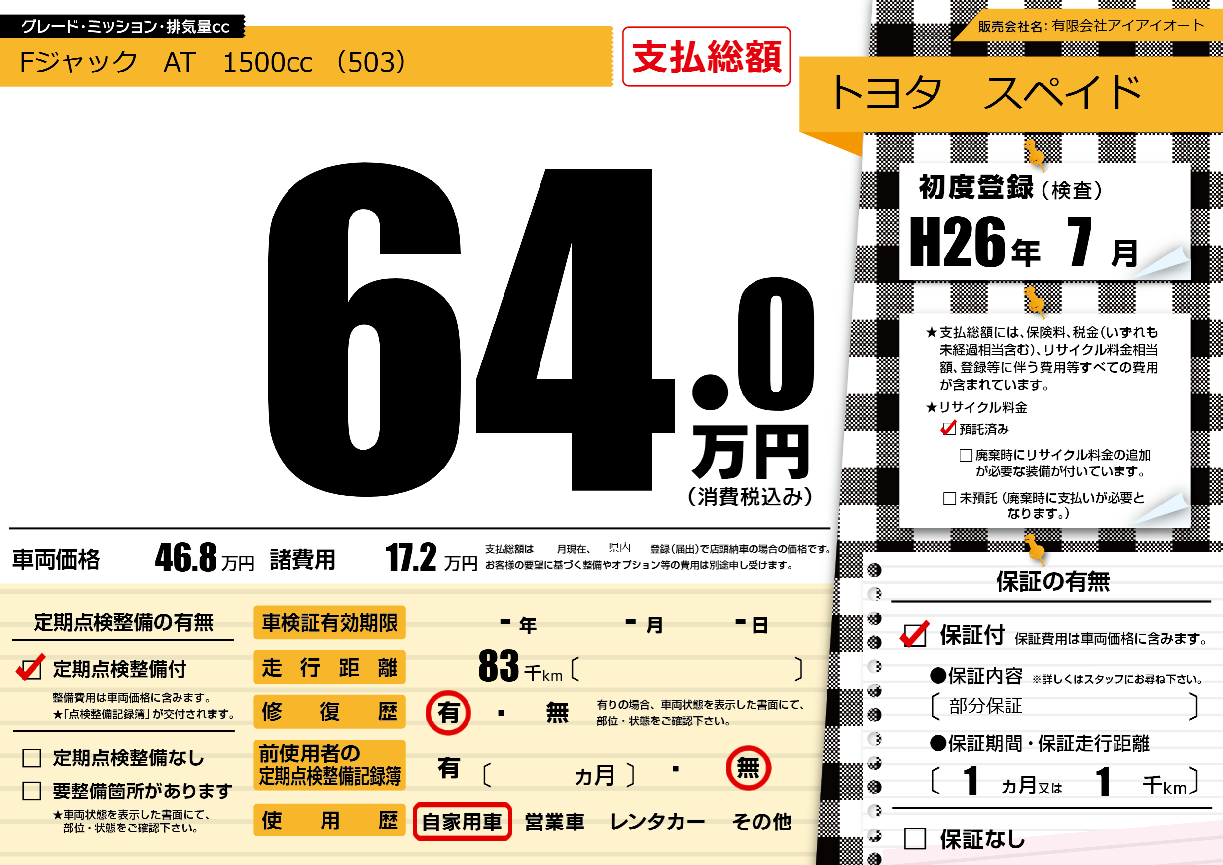 | 車名 | トヨタ スペイド | グレード ミッション 排気量 |