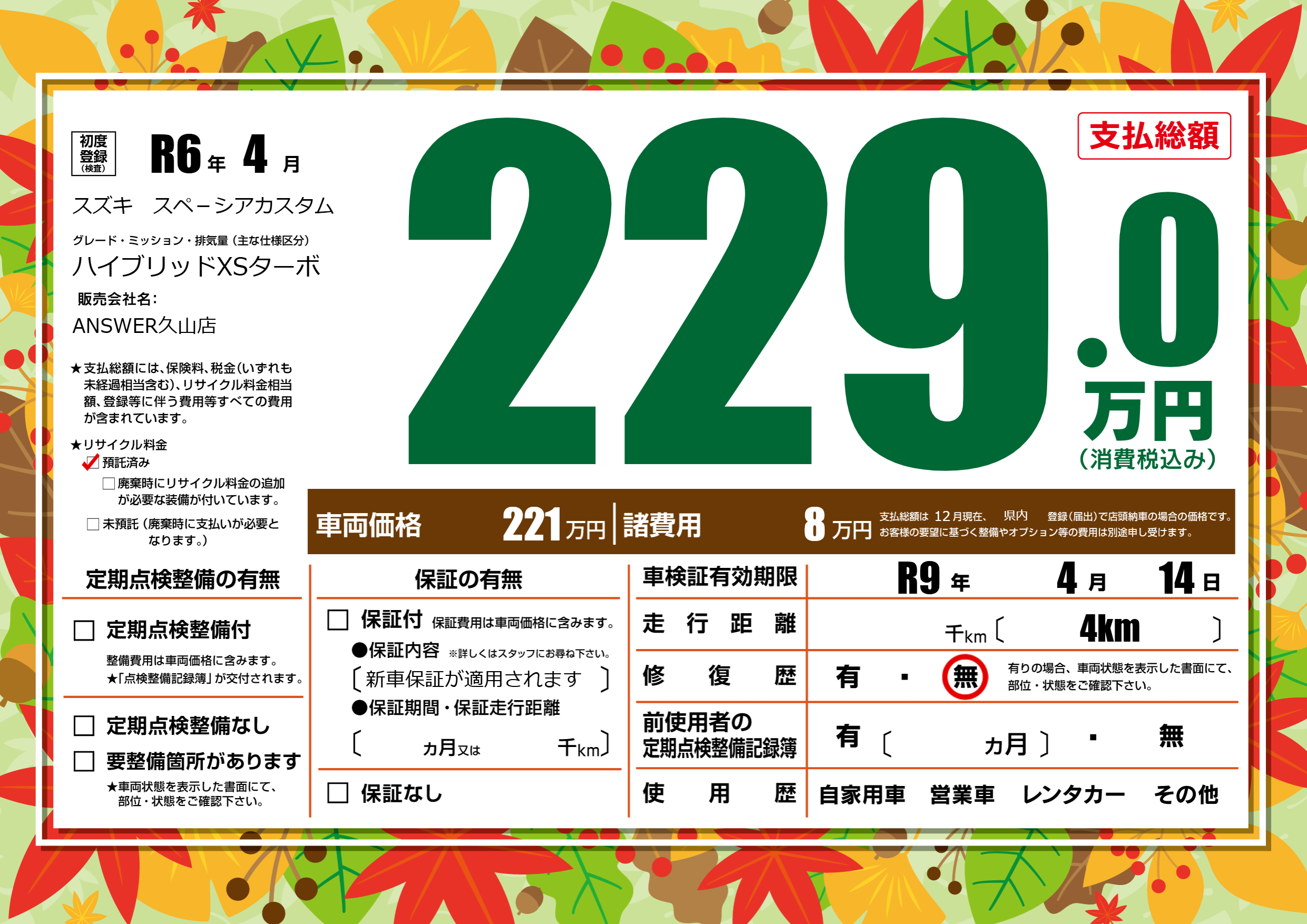 | 走行キロ | - | 初年度登録 | R6年4月 |