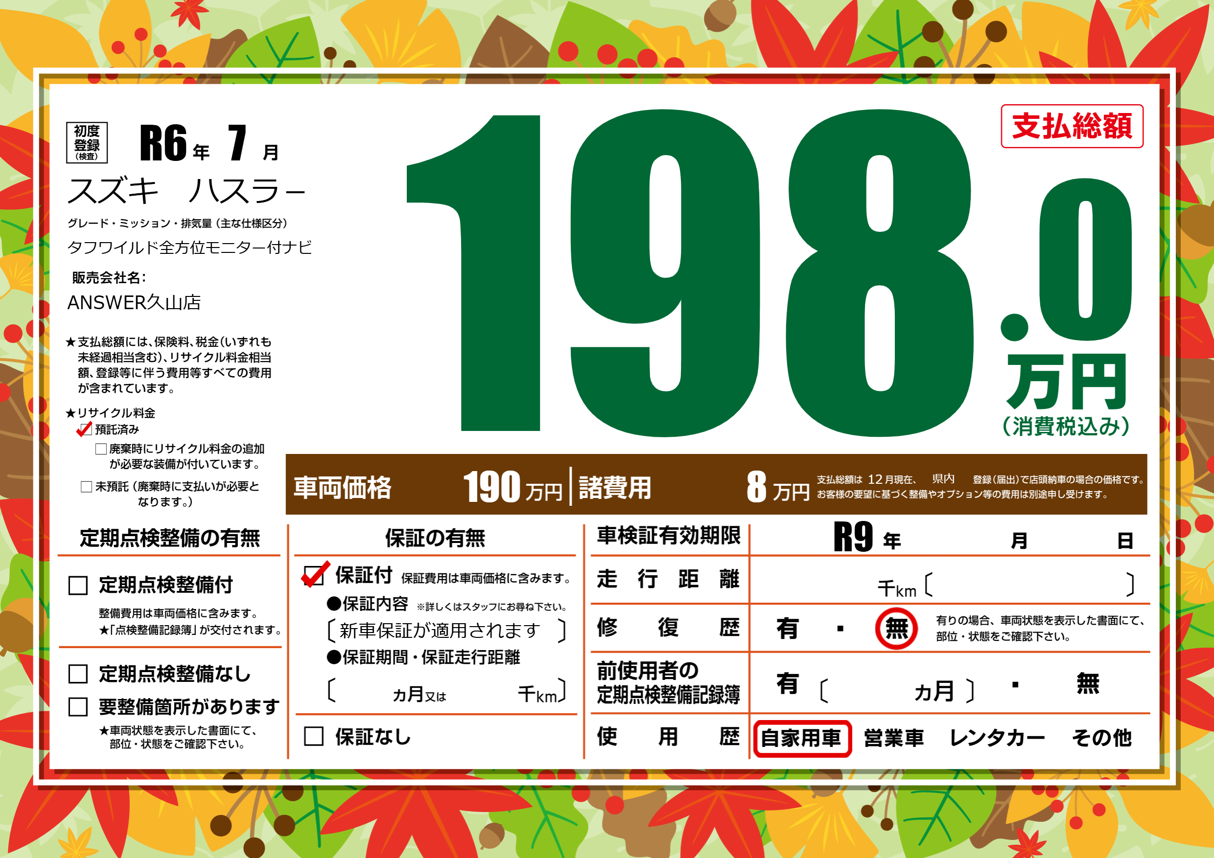 なし | 車検制限 | R9年---月---月 |