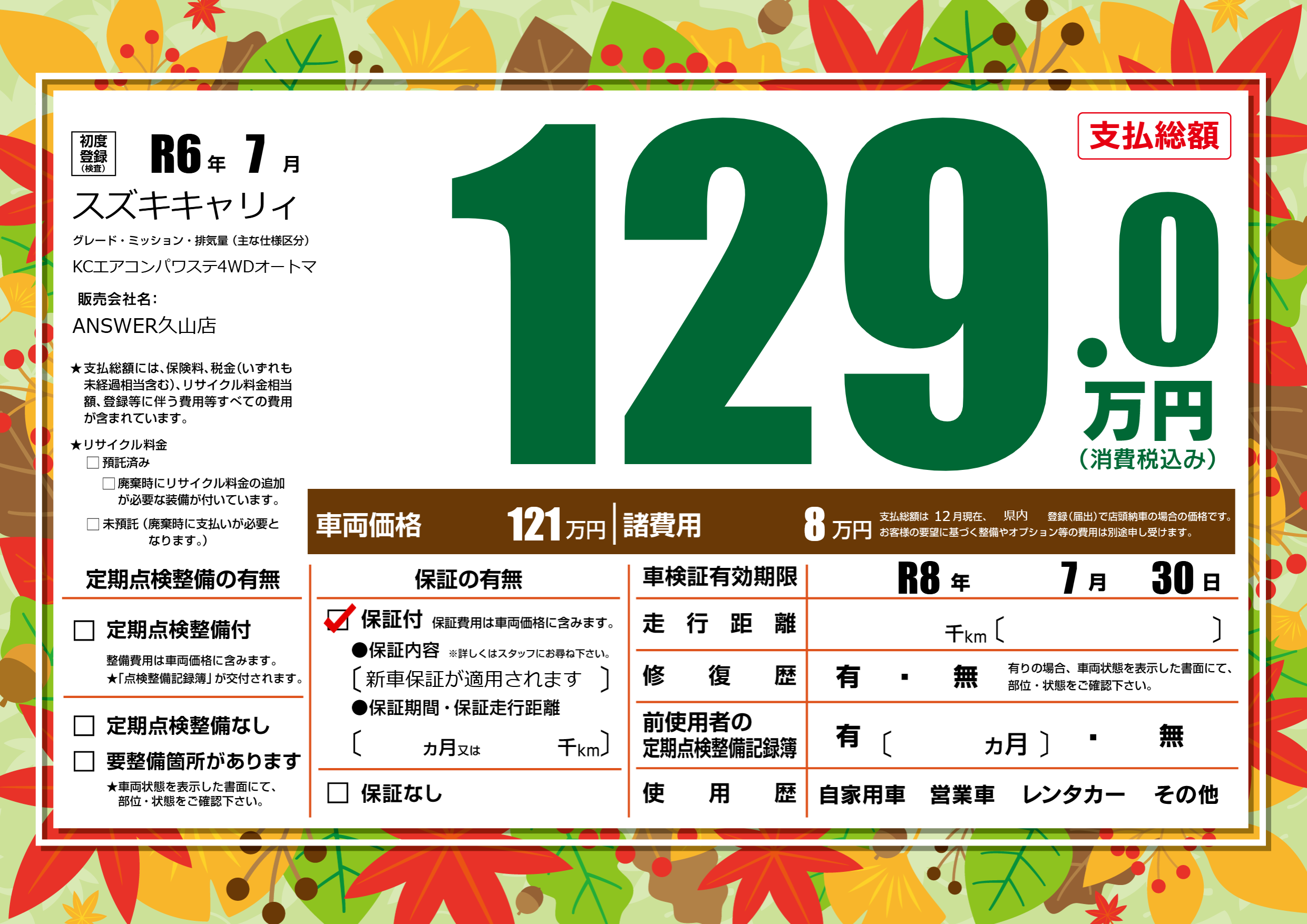 保証付き 保証内容(新車保証が適用されます) ---ヶ月または()千kmまで |