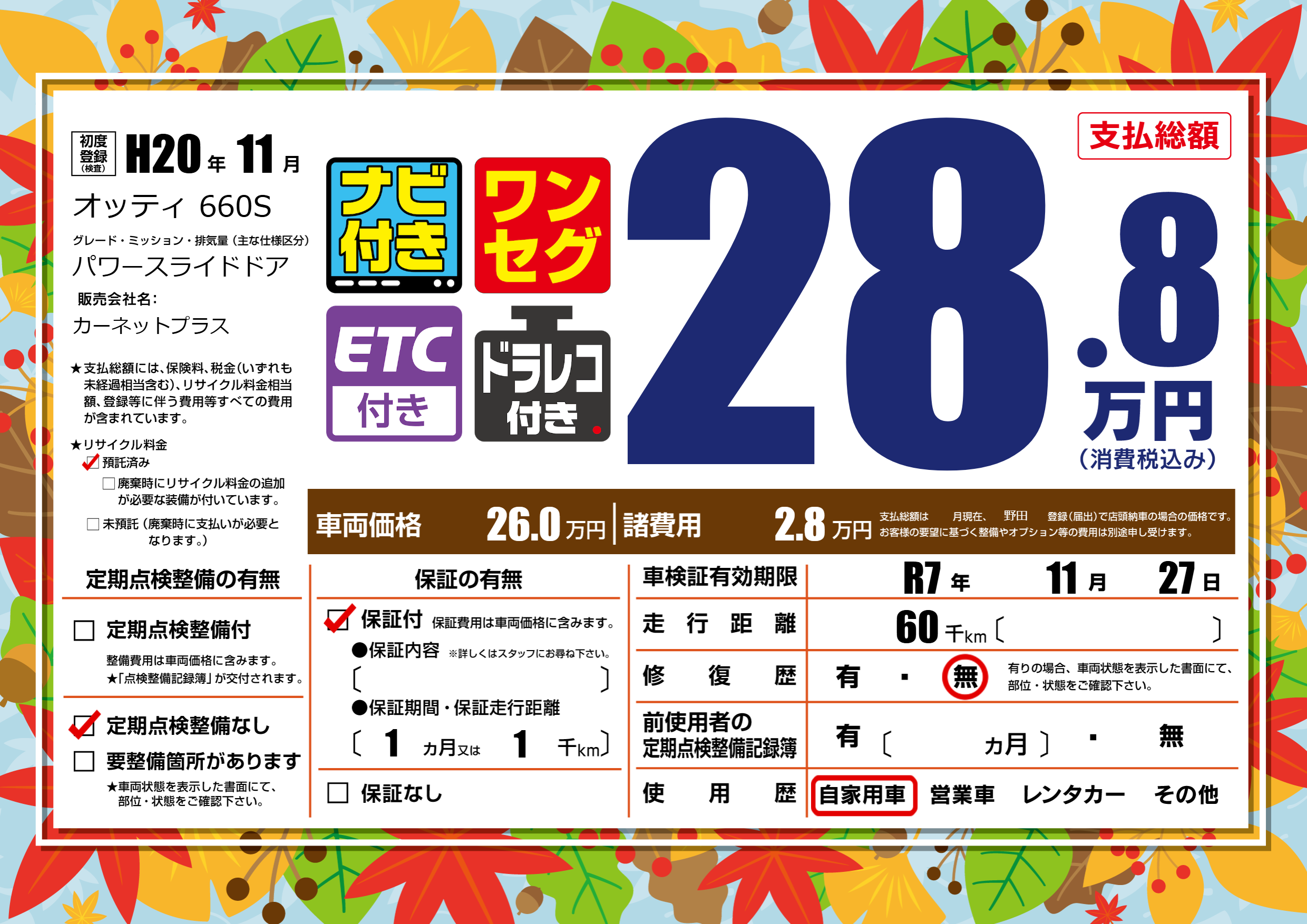 | 車名 | オッティ 660S | グレード ミッション 排気量 |