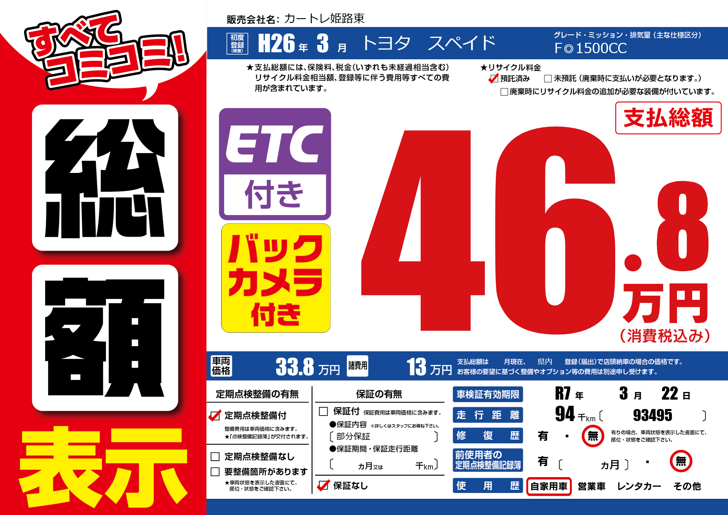 | 車名 | トヨタ スペイド | グレード ミッション 排気量 |