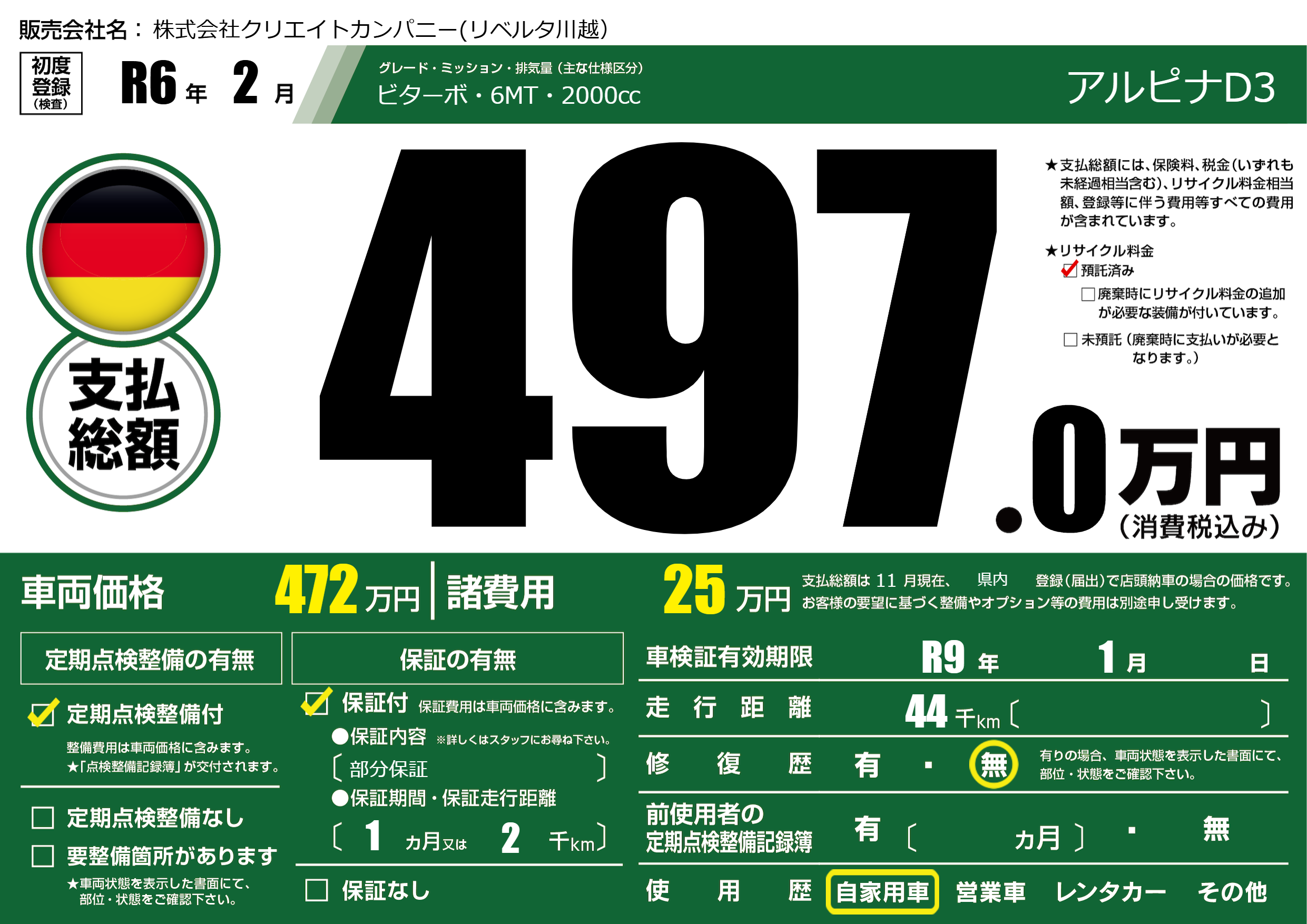 | 車名 | アルピナD3 | グレード ミッション 排気量 |
