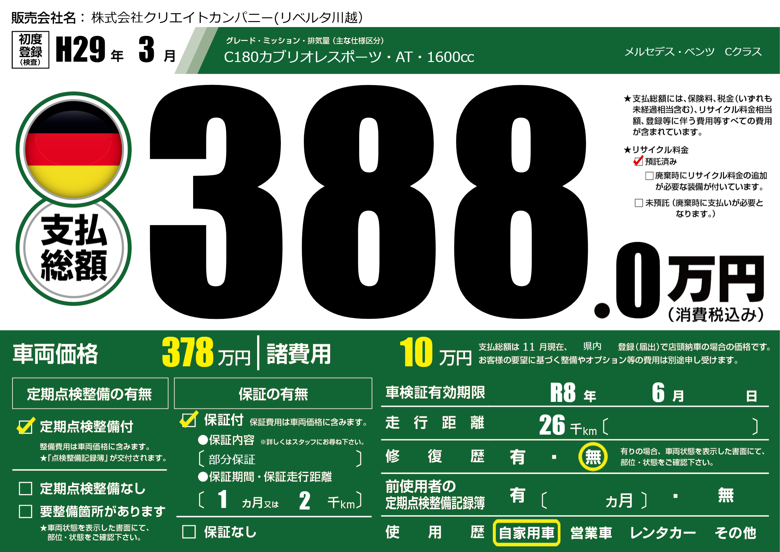 | 車名 | メルセデス・ベンツ Cクラス | グレード ミッション 排気量 |