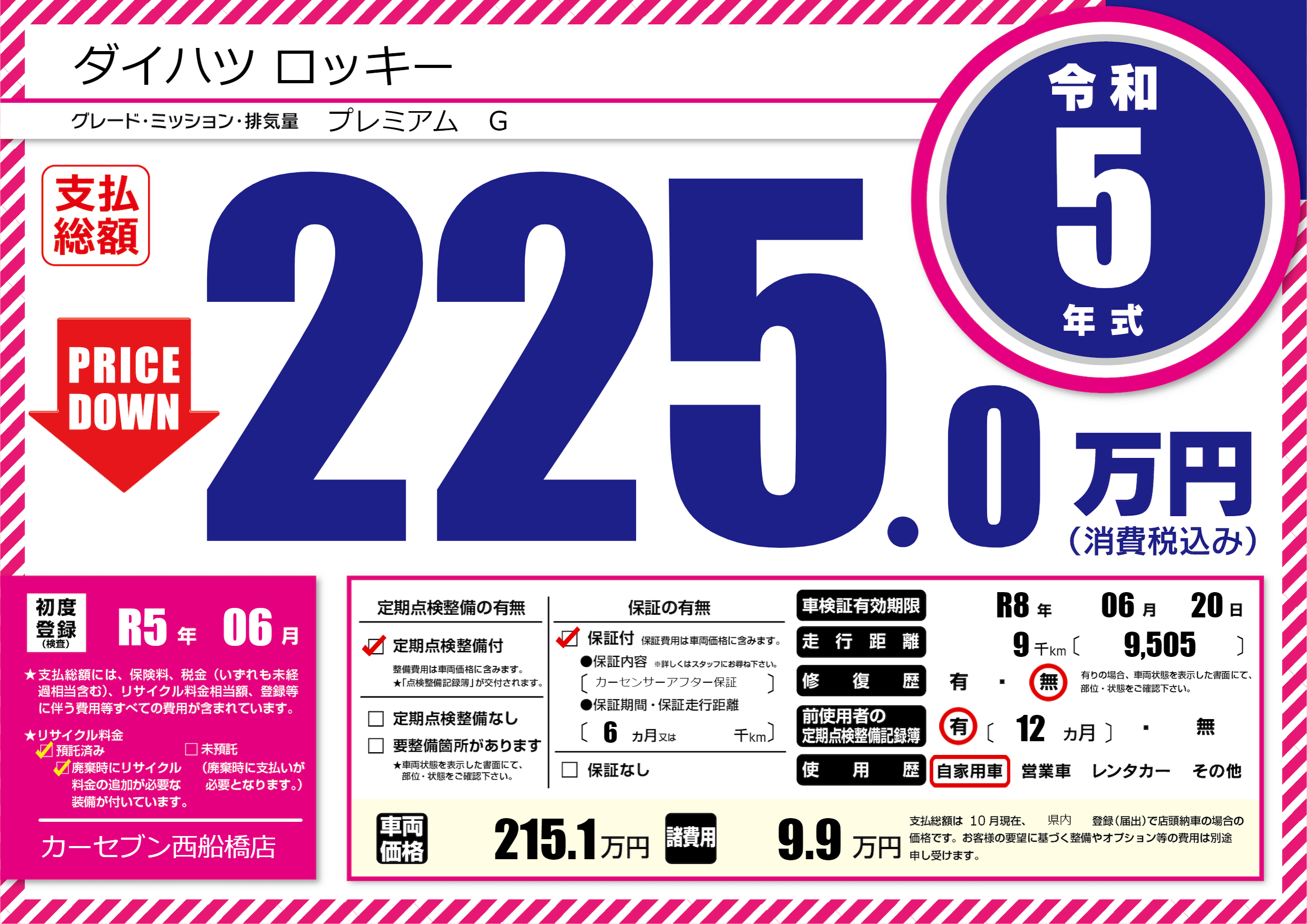 | 走行キロ | 0.9万km | 初年度登録 | R5年06月 |
