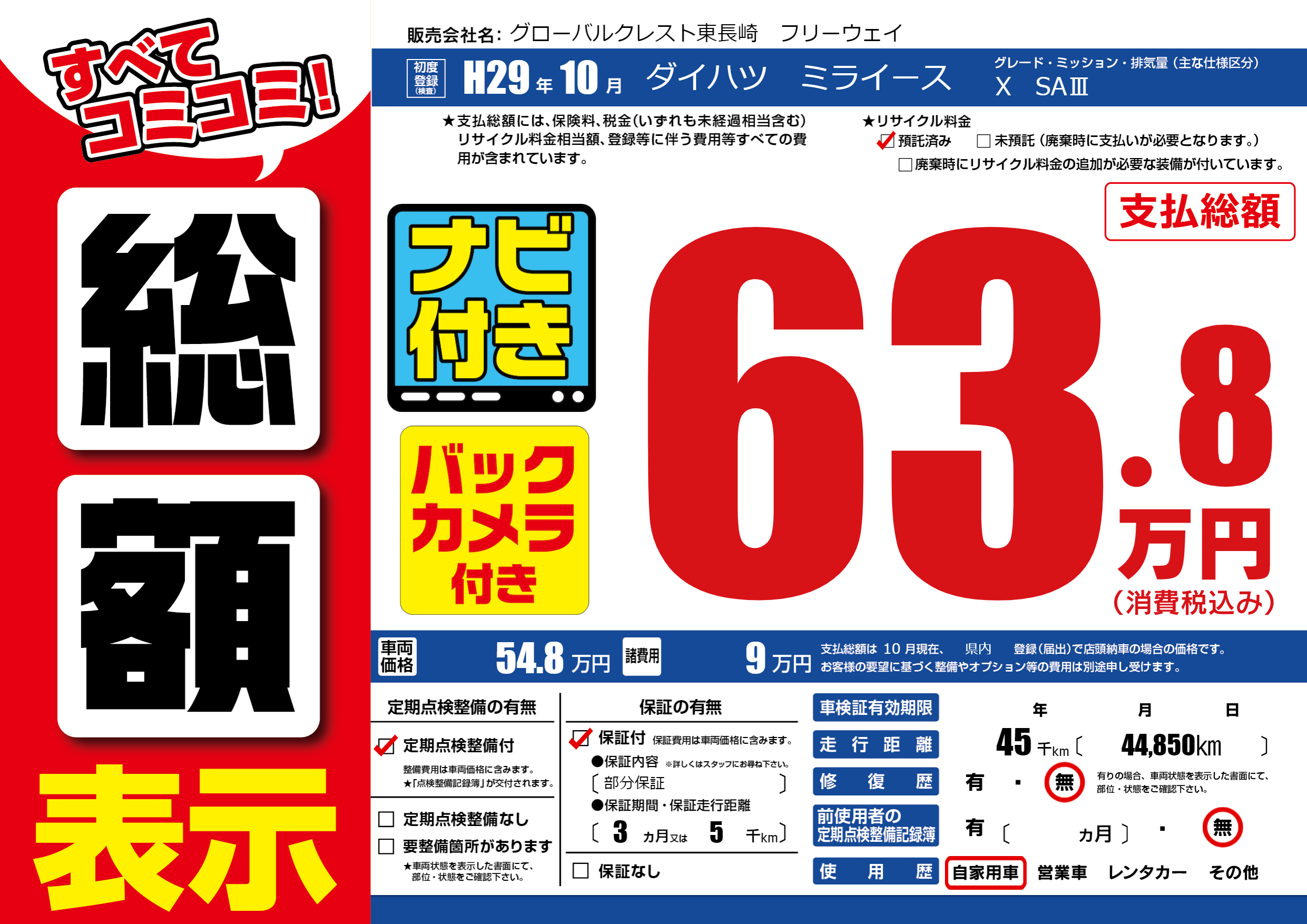 | 走行キロ | 4.5万km | 初年度登録 | H29年10月 |