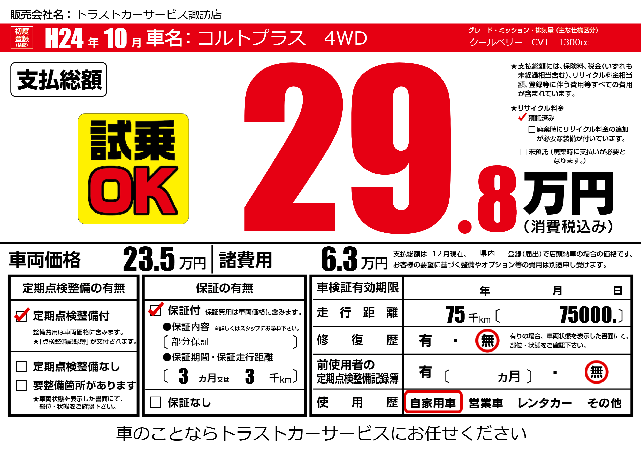 | 走行キロ | 7.5万km | 初年度登録 | H24年10月 |