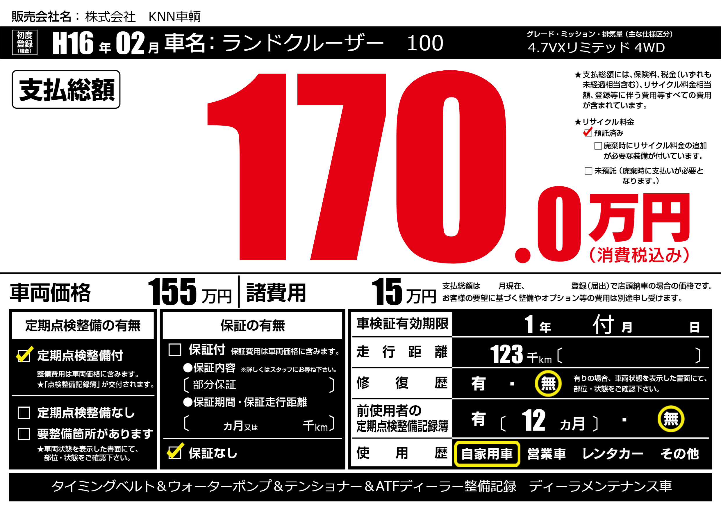 | 車名 | ランドクルーザー 100 | グレード ミッション 排気量 |