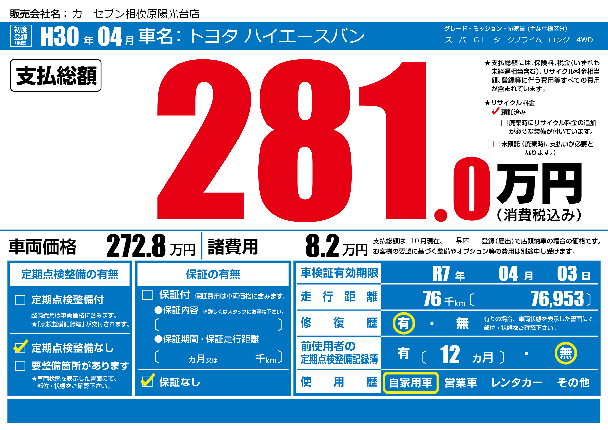 | 車名 | トヨタ ハイエースバン | グレード ミッション 排気量 |