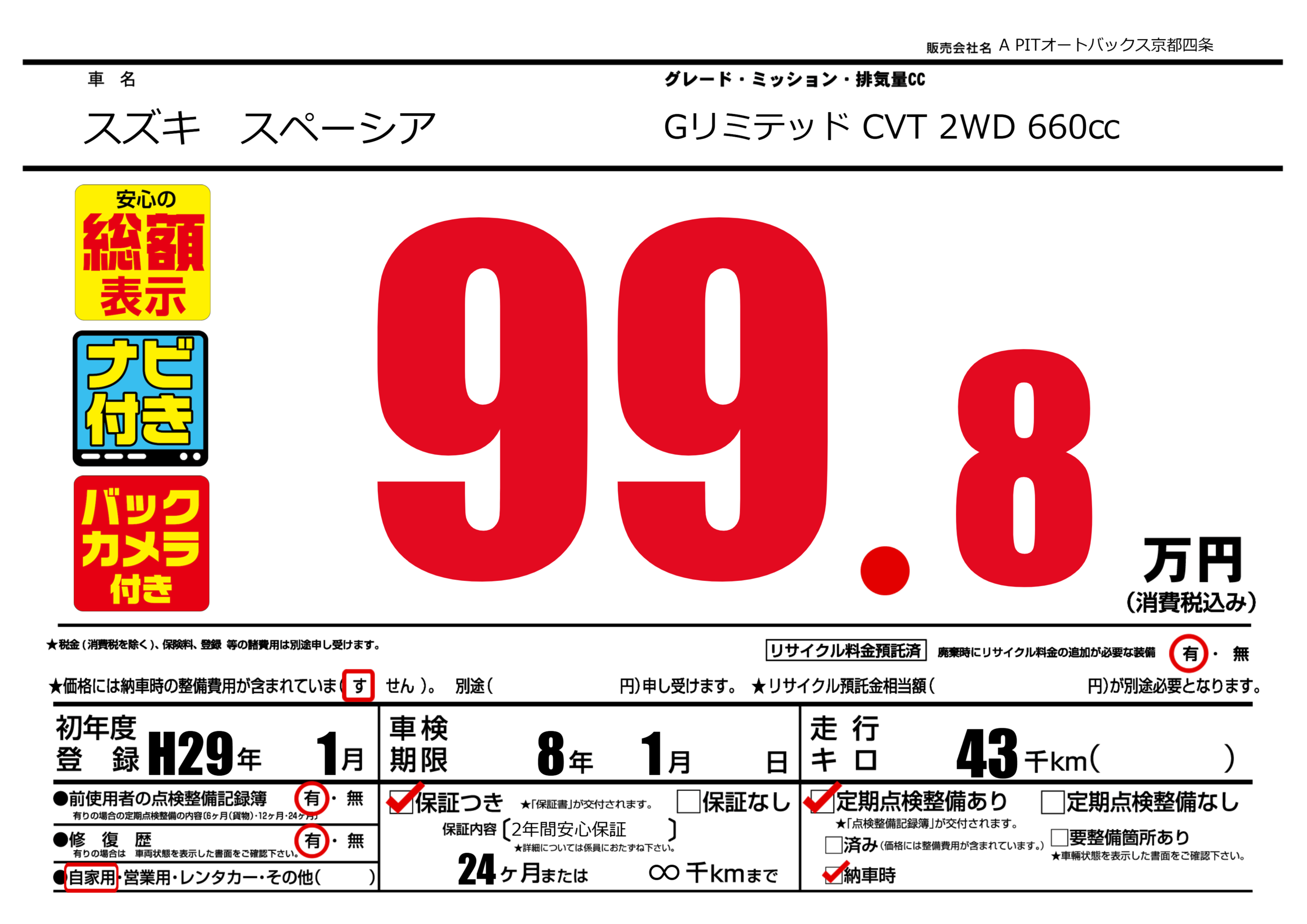 | 車名 | スズキ スペーシア | グレード ミッション 排気量 |