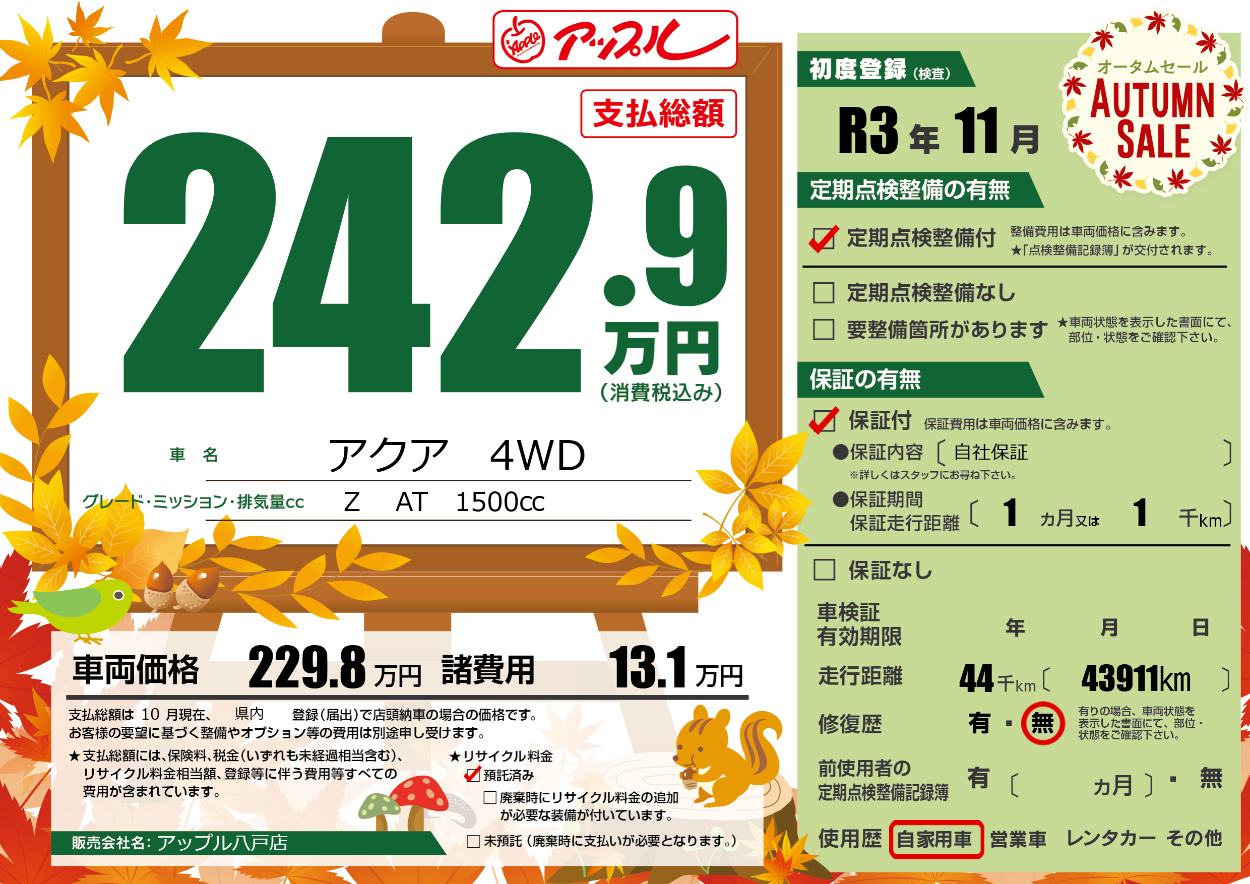 保証付き 保証内容(自社保証) 1ヶ月または(1)千kmまで |